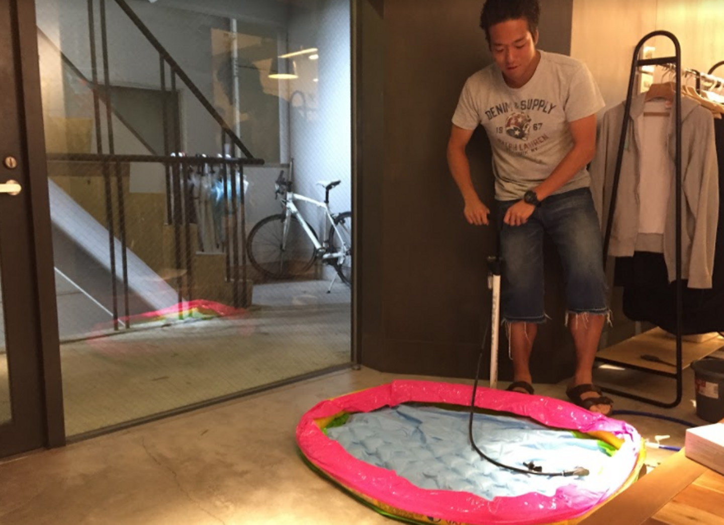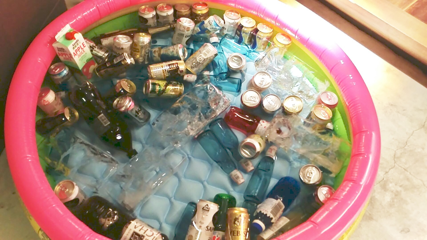 ビールやラムネは部屋の外にビニールプールを設置しました。(つかの間の冷え冷え)
