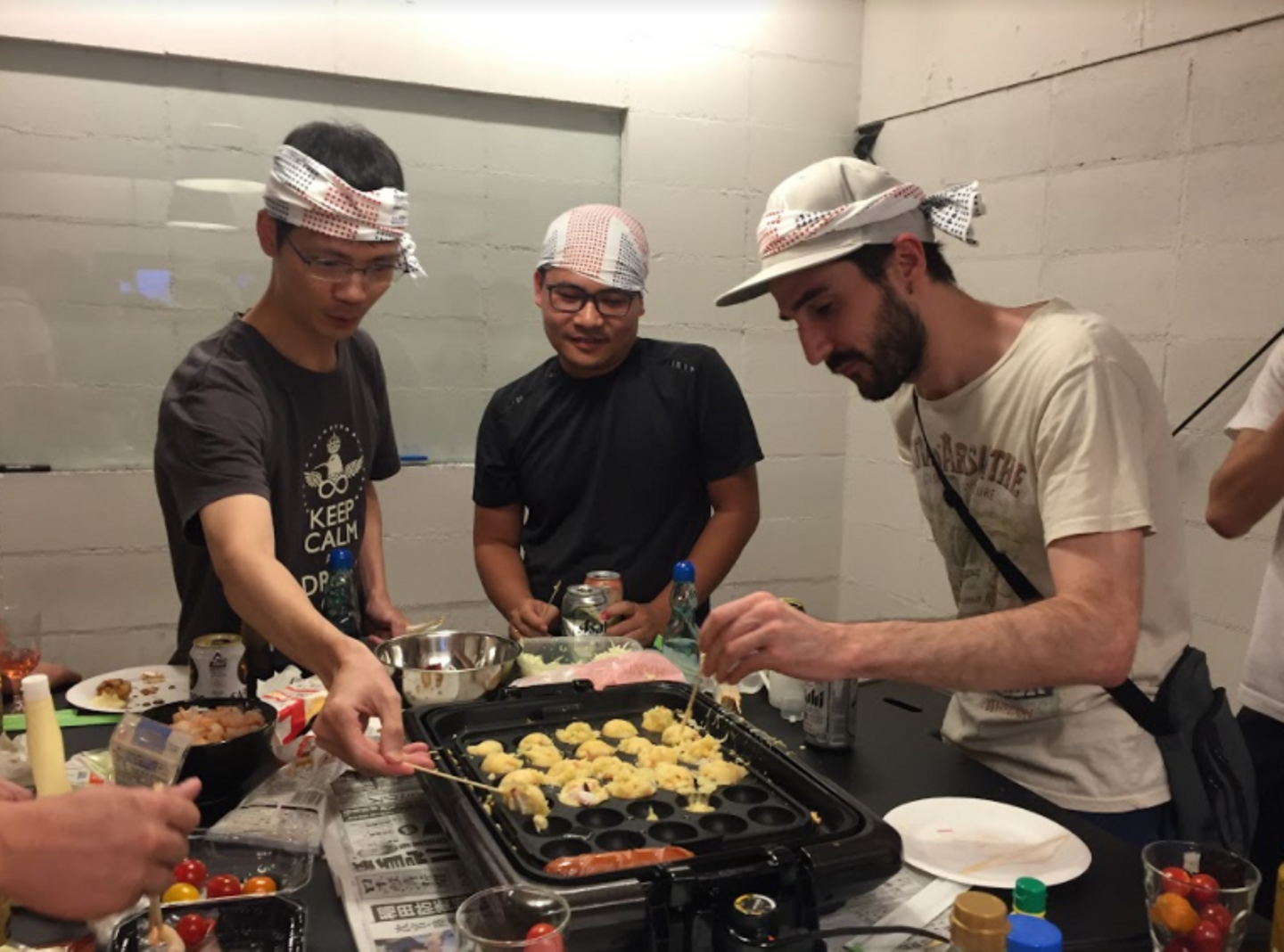 まだ日本に来て日が浅い、ピンさん(中国)・フンさん(ベトナム)と、なぜか手慣れているルドー(フランス)のTAKOYAKIトリオが頑張って焼いてくれました。
