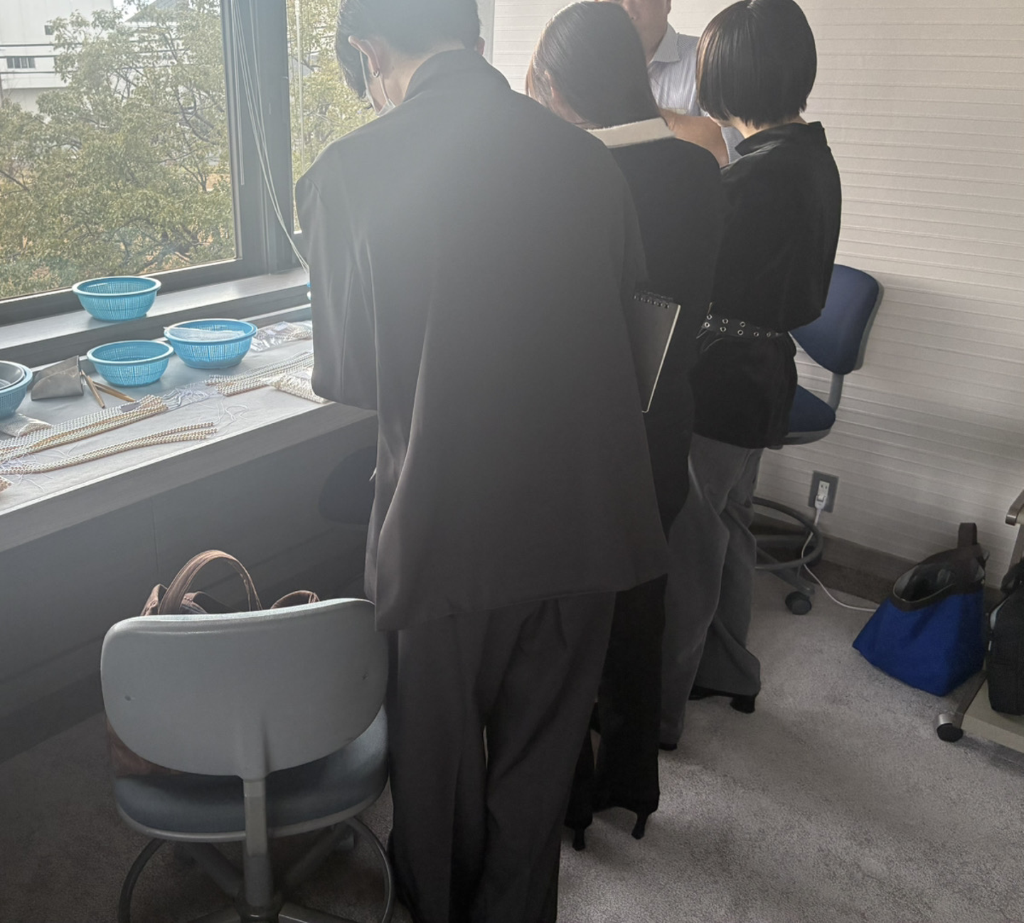 真珠の加工の現場を見学し、真珠の穴あけや、形、品質の選別、ネックレスの連組の様子を実際に見て学ぶことができました✨