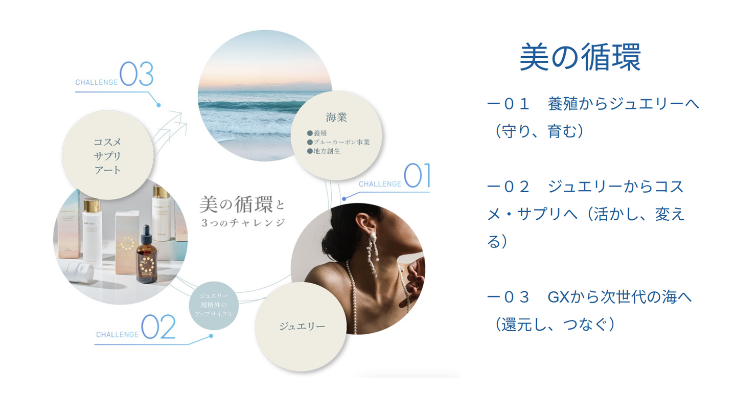 そして、美しくなった海で真珠を育てる-このようにして、「海業」「ジュエリー」「コスメ、サプリ、アート」の3つの要素が海を起点として循環していくことを、WSPは「美の循環」と呼んでいます。