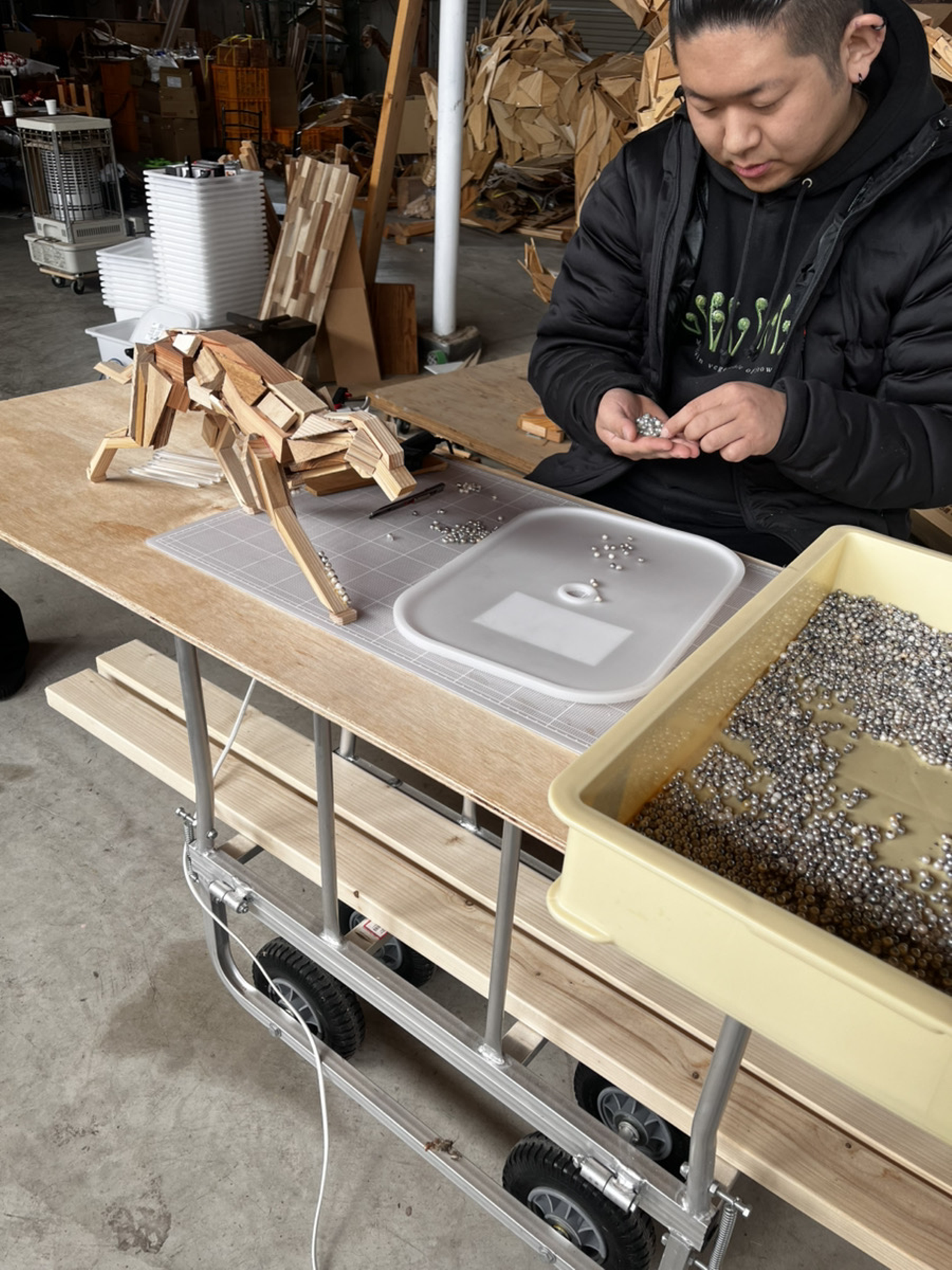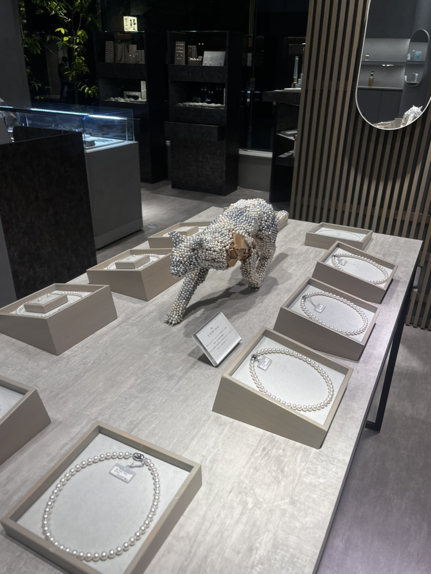 約4,000個ものネイチャーパールと木の廃材を使ってつくられた、まさに一点物のアートです。
