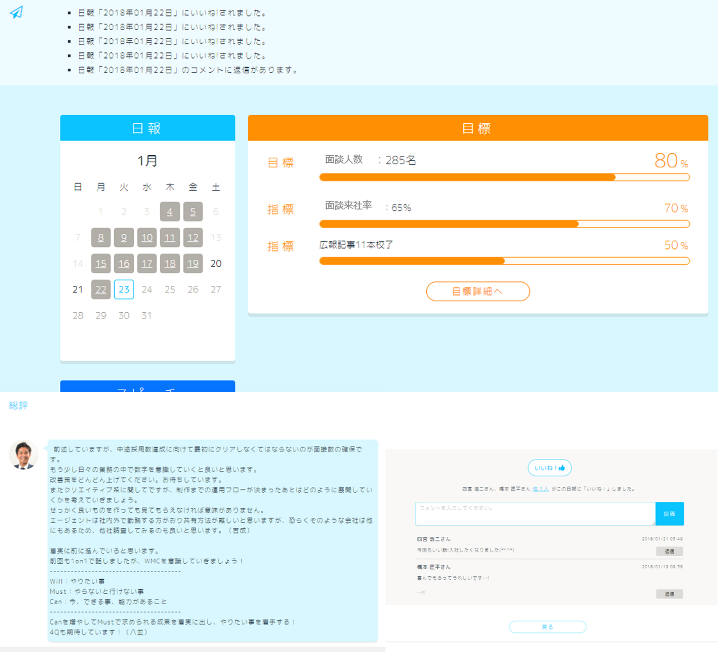 ▲日報管理システム。目標は勿論、日報も全社員で共有します。日報には「いいね!」やコメントも投稿でき、拠点や役職問わず、SNSのように気軽にコミュニケーションが取れるツールです。
