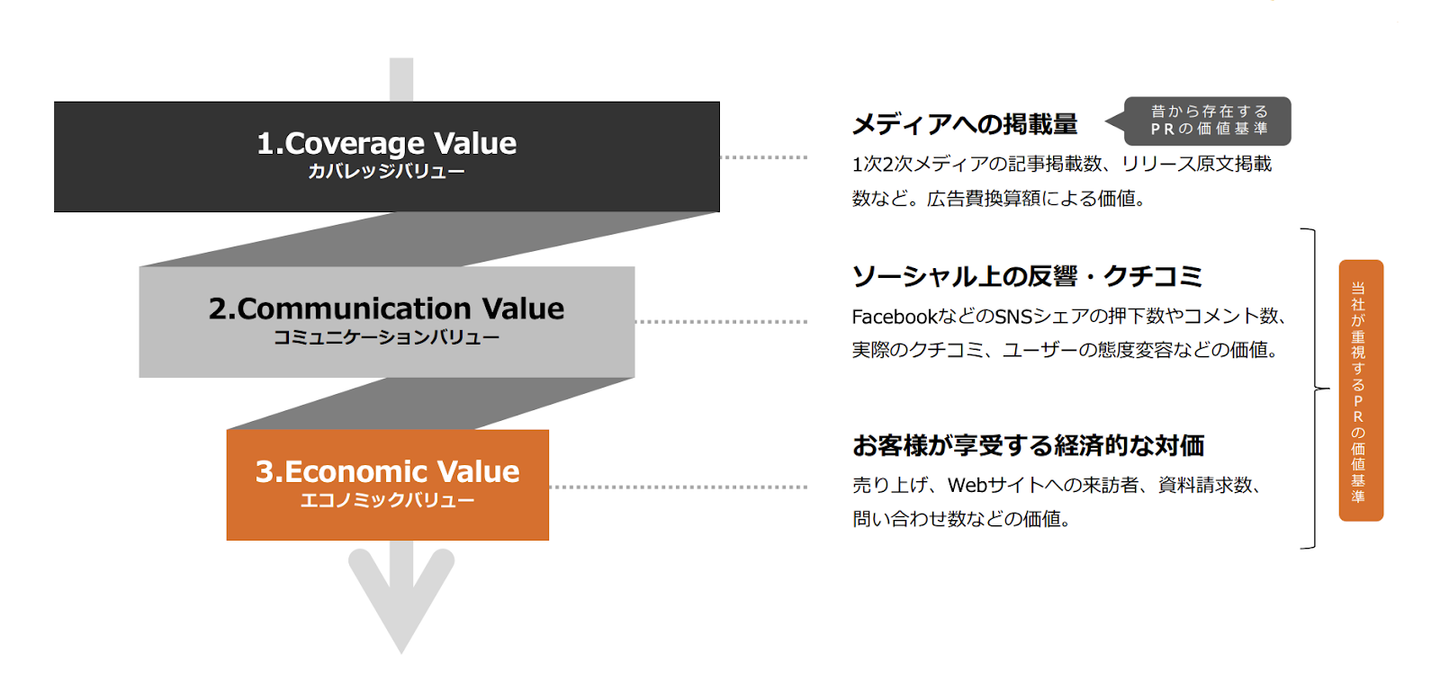 アウル株式会社のPRコンサルタントが活動の指針とするのは、「Coverage Value(カバレッジバリュー)」「Communication Value(コミュニケーションバリュー)」「Economic Value(エコノミックバリュー)」という 3つのバリュー です。この独自の視点を軸に、クライアントの課題解決とビジネス成果の最大化を実現しています。