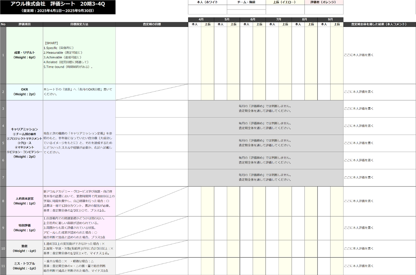 - 勤怠: よほど状況が悪くない限り(例:月3回以上の遅刻等が半期で3ヶ月以上続くなど)、減点にはなりにくい比較的緩やかな基準です。