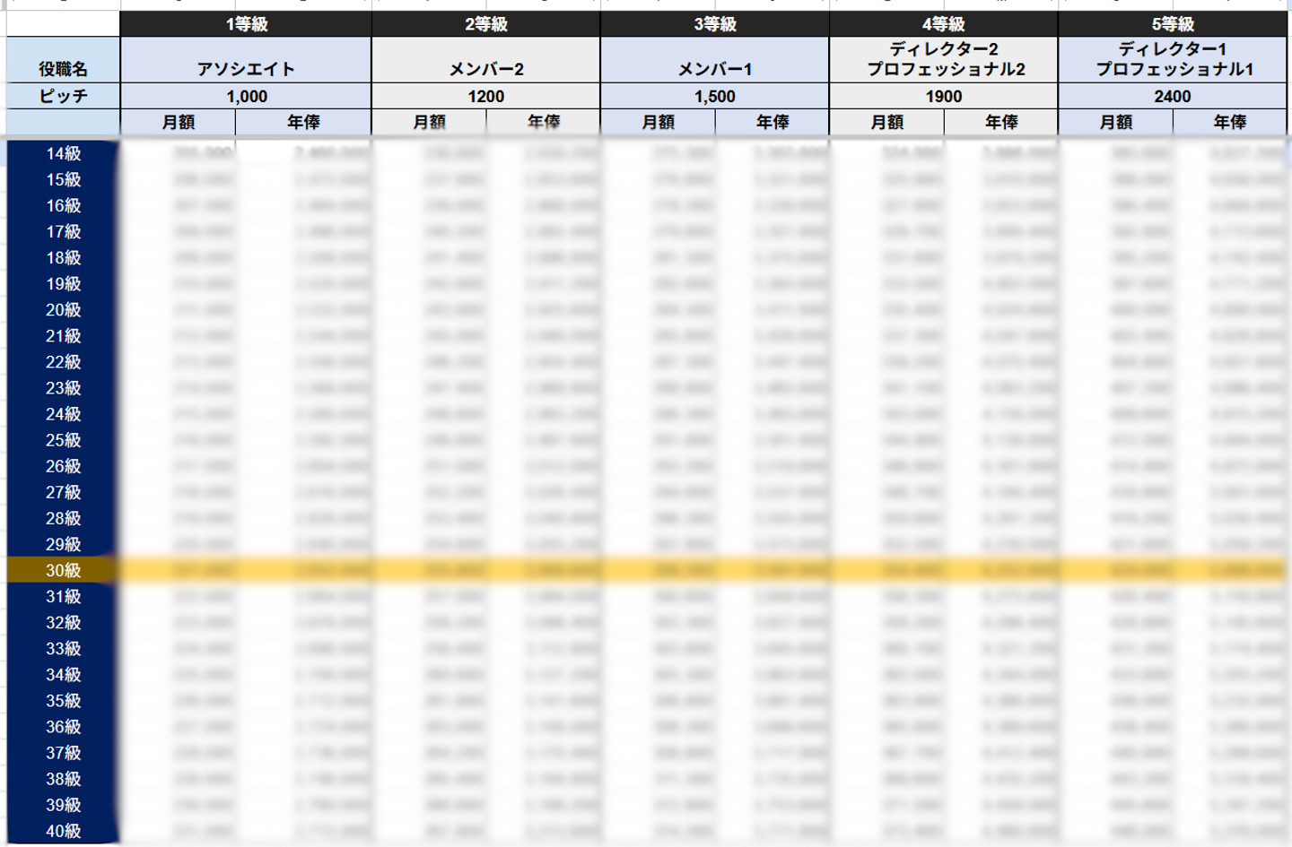 そして、この評価ランクと会社の業績を掛け合わせて、具体的な給与の変動幅が決まります。アウルでは、役職(メンバー、ディレクター、マネージャーなど)と、各役職内での細かい等級(1級~40級)によって構成される明確な「給与テーブル」が存在します。