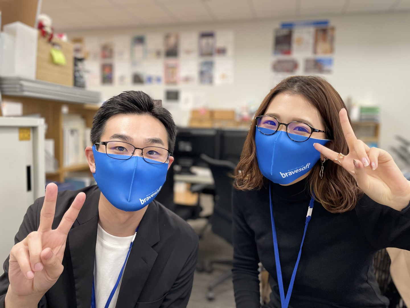 ちなみにみんなが手に持っている青いのはbravesoftのオリジナルマスク!