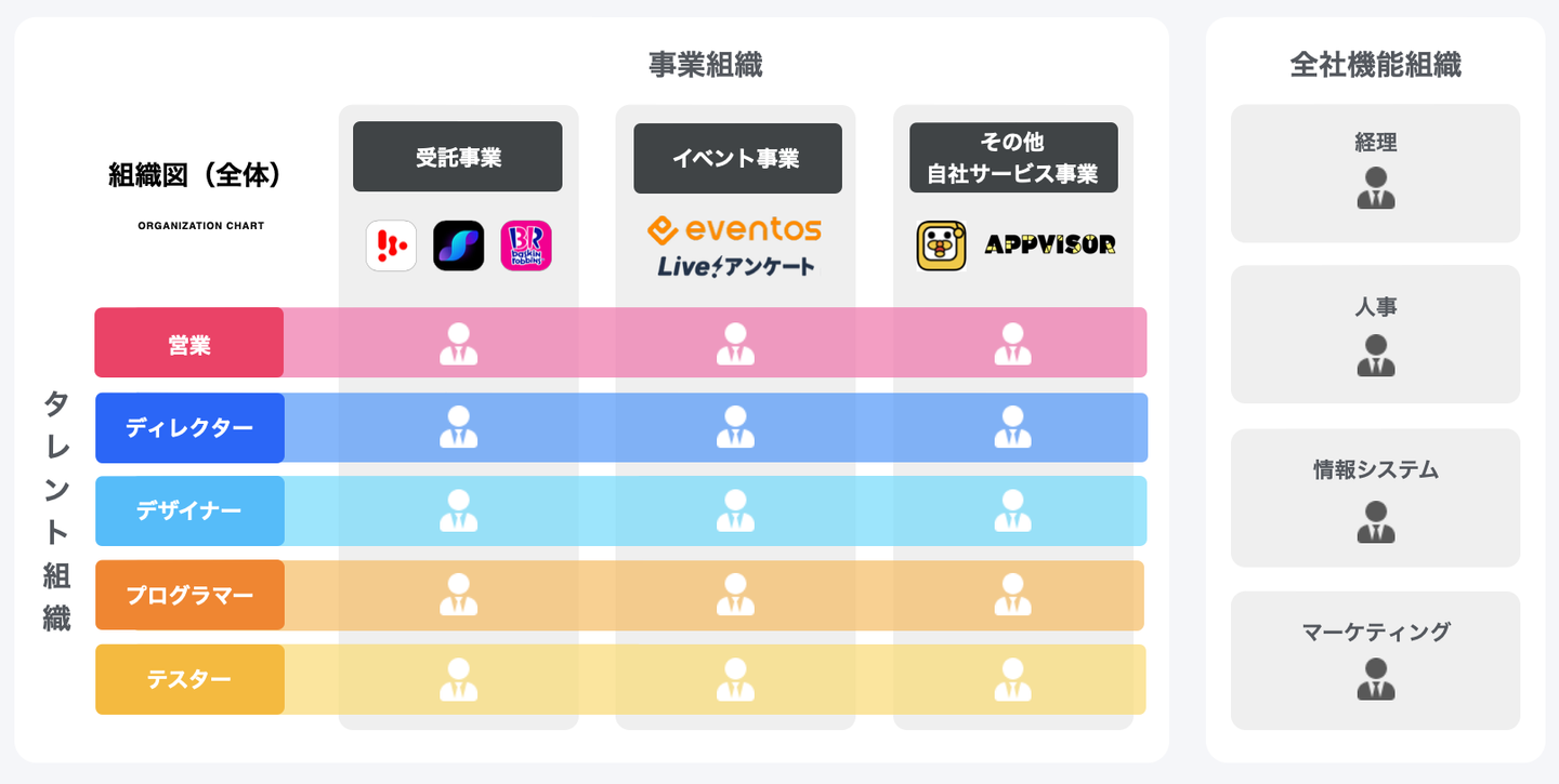 bravesoftではマトリックス組織の体制をとっており、従来の職能別組織に各機能を横断するプロジェクトまたは製品別事業を交差させた体制となっています。