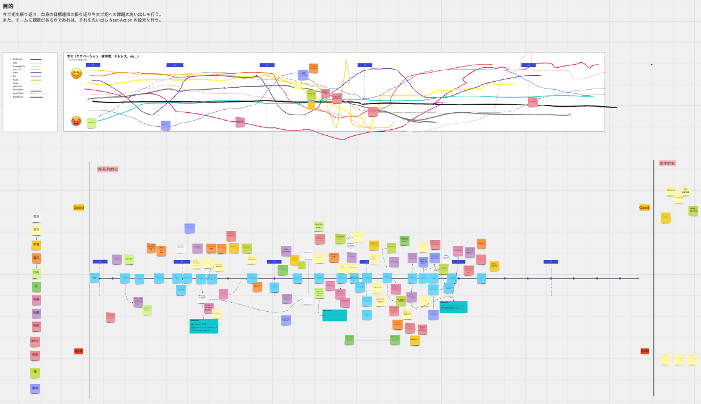 最初の1回では半年分をで振り返ったのですが、メンバーから「半年分を思い出すのは長い、忘れている」という意見があったので2回目は3ヶ月分で振り返りを行いました。3ヶ月での振り返りはちょうどよい期間だったと思ってます。