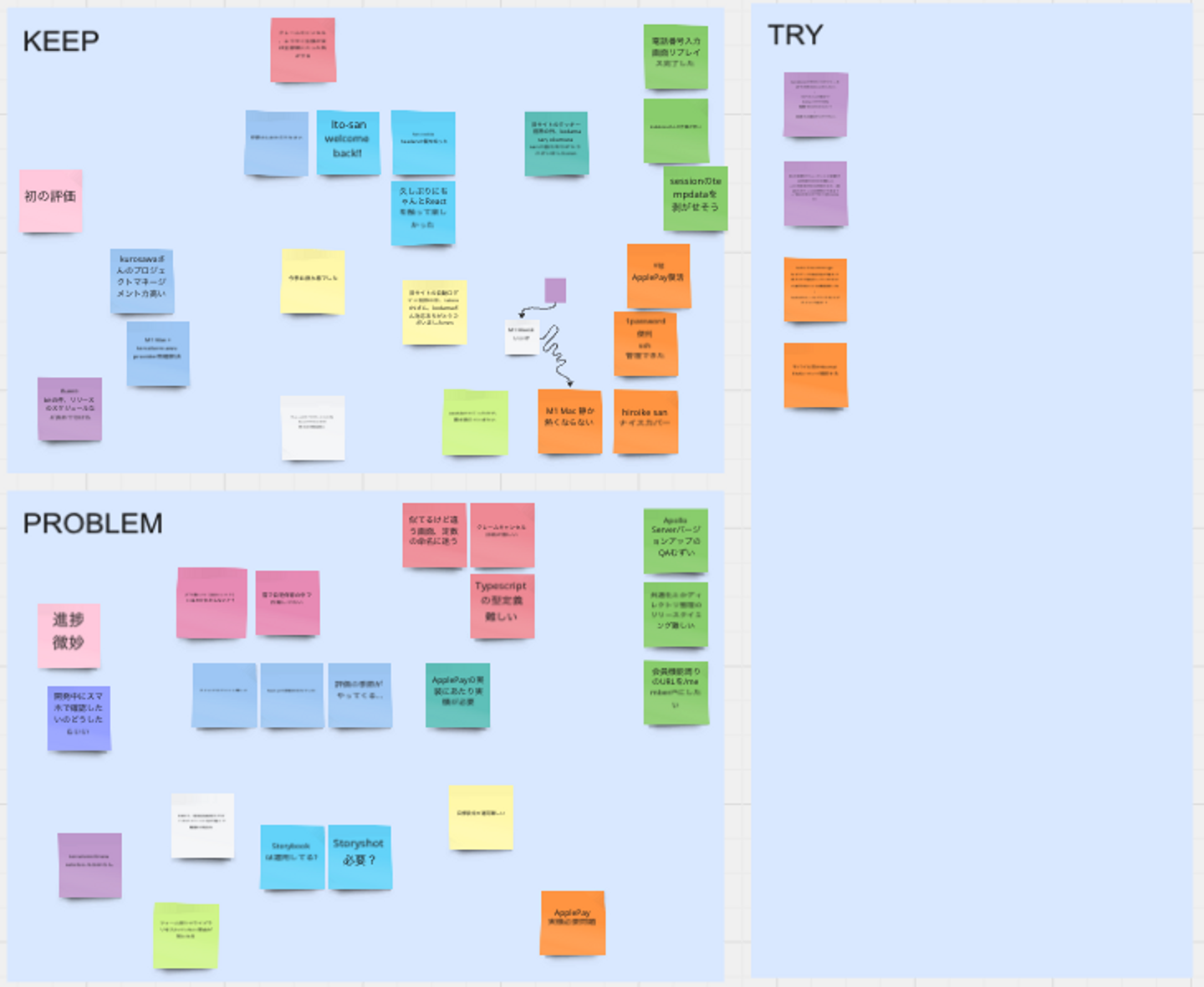 検索されると多くの記事が出ますし、本も出版されておりますが、簡単にいうと、Keep /Problem / Try の3つの観点で行動を振り返えるフレームワークです。フロントエンド開発グループでは毎週金曜日の夕方に全員でKPT法を使った1週間の振り返り会をZoom & Miroで実施しております。この振り返り会は2年以上続いております。