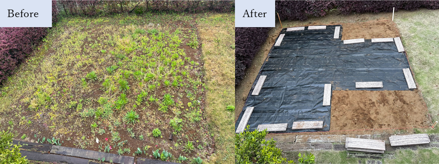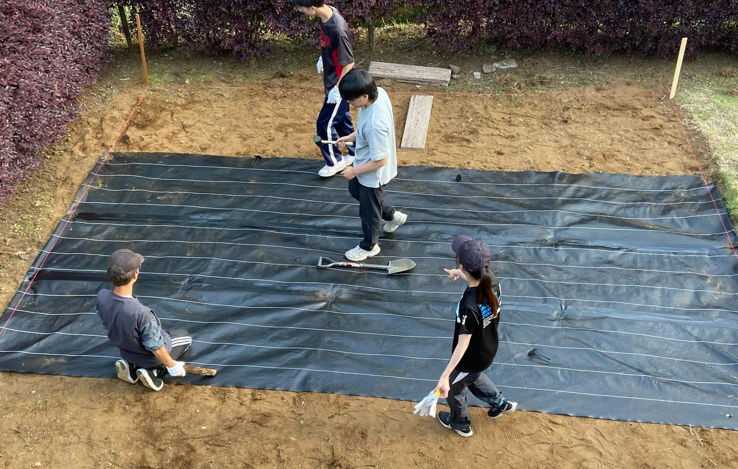 ここまでに予定より長い時間がかかったため、第二工程の除草シートを敷くことが本日の最終目標となりました。除草シートをガーデニングスペースにTの字になるように協力して端を抑えて数か所張っていきます。雑草が生えてこないよう、シート間をテープで止めたり、ペグで多めに抑えたりしました。