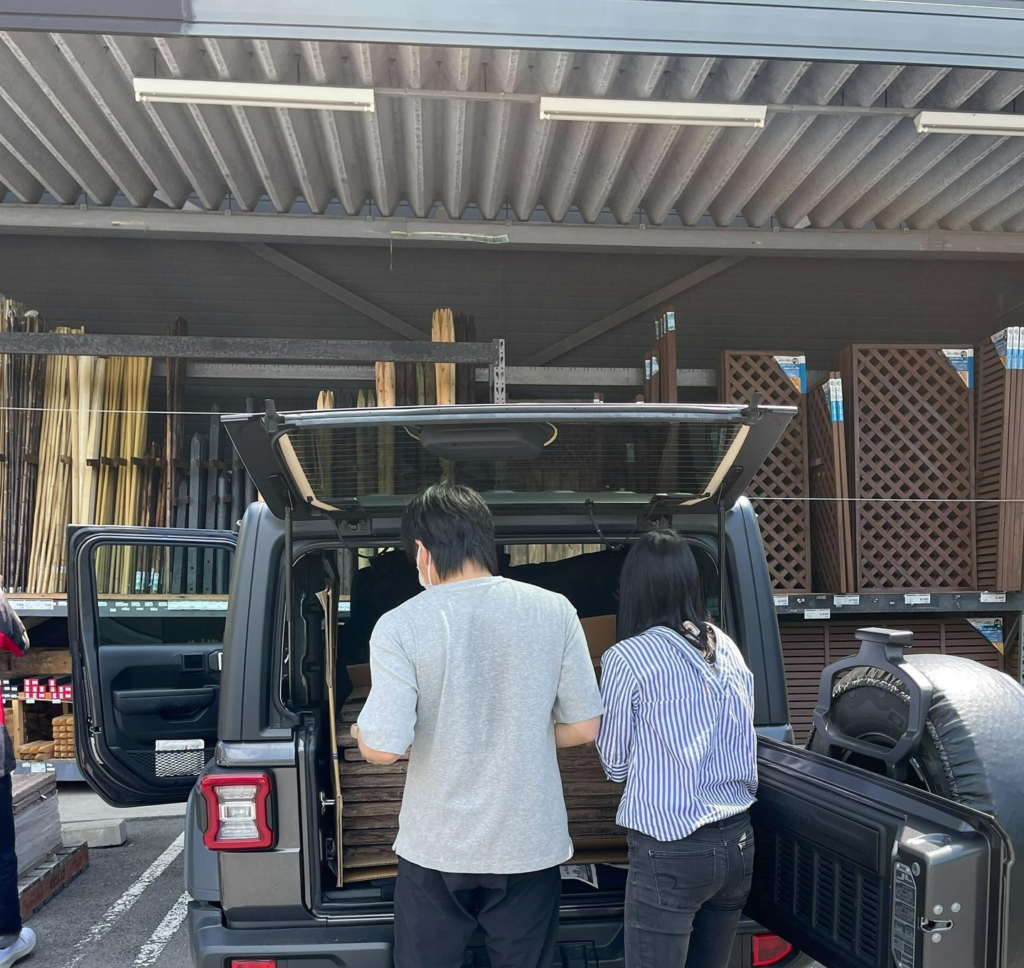 そして迎えた当日。まずはホームセンターに向かい必要な資材や用具を購入し、車へと搬入します。