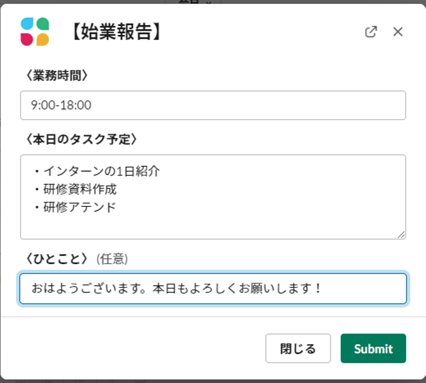 今日の業務を確認したら、社内連絡ツールslackで始業報告をします。今日は午前に資料作成と研修準備、午後に研修アテンドの予定です。