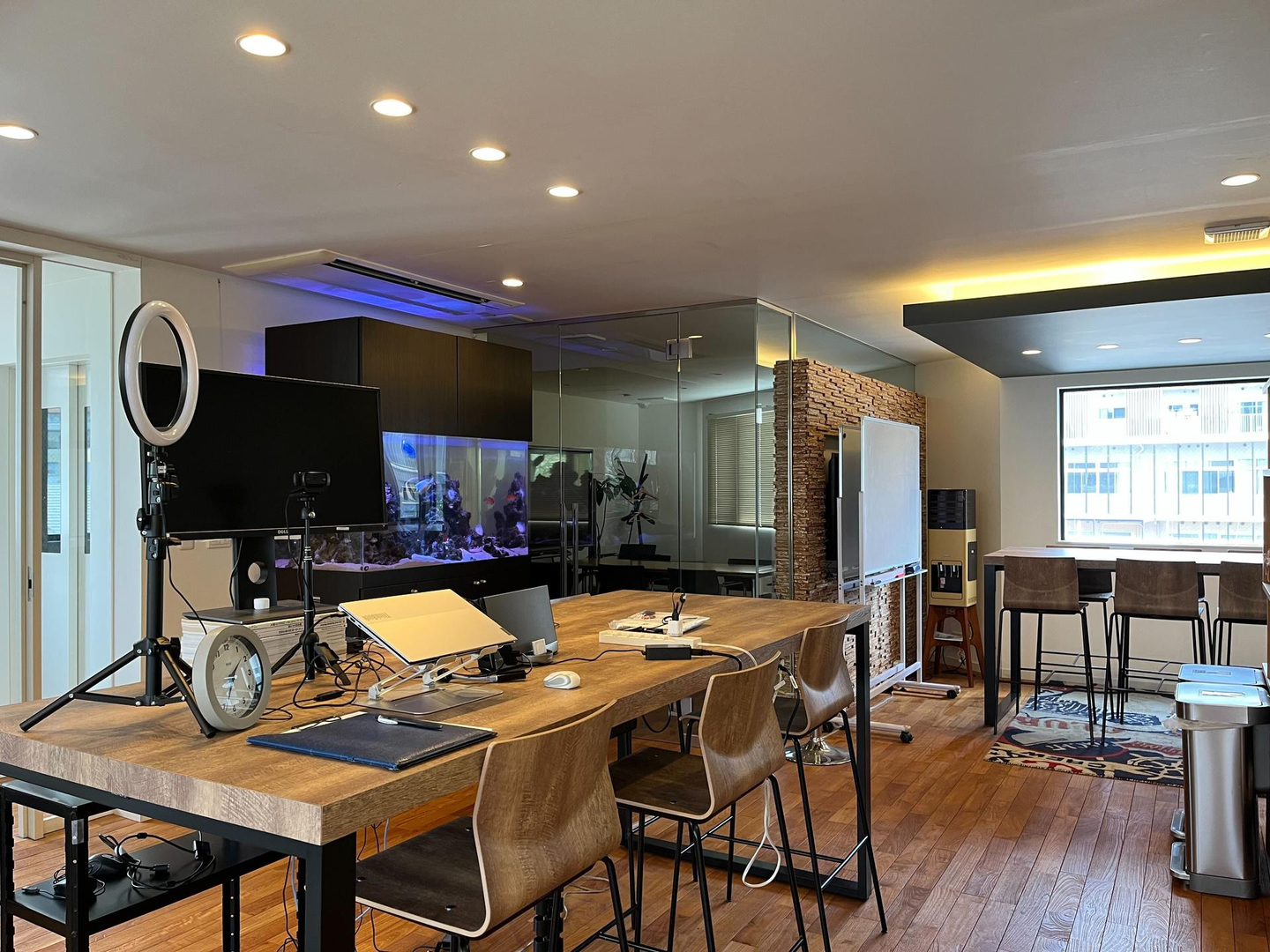インターホンを押してドアを開けてもらい、エレベーターで2階へ。今日使う席を決めてPCなどを準備します。
