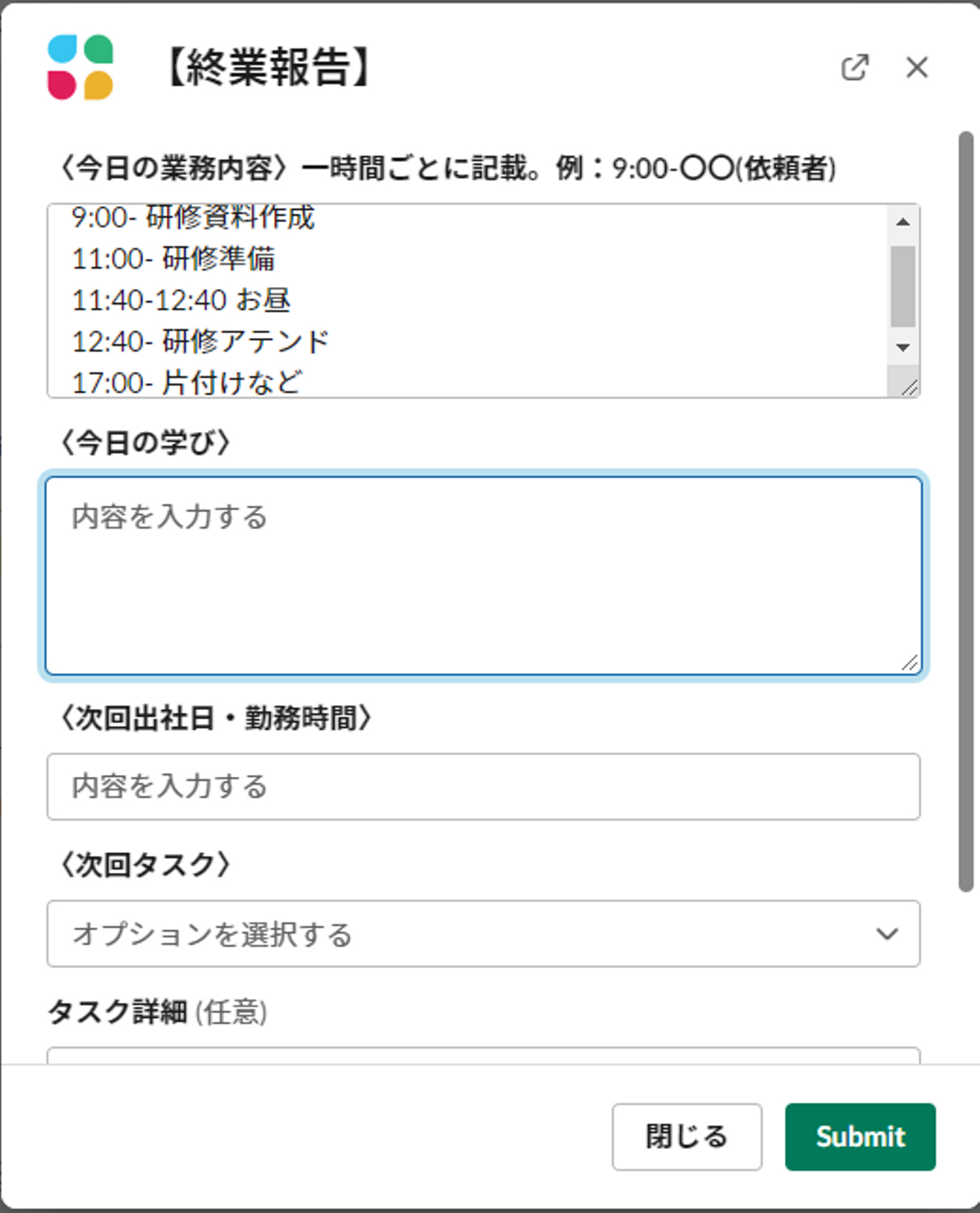 始業報告と同様、slackで就業報告をします。今日の業務内容と学んだこと、次回出勤について共有したら今日の業務は終了です。