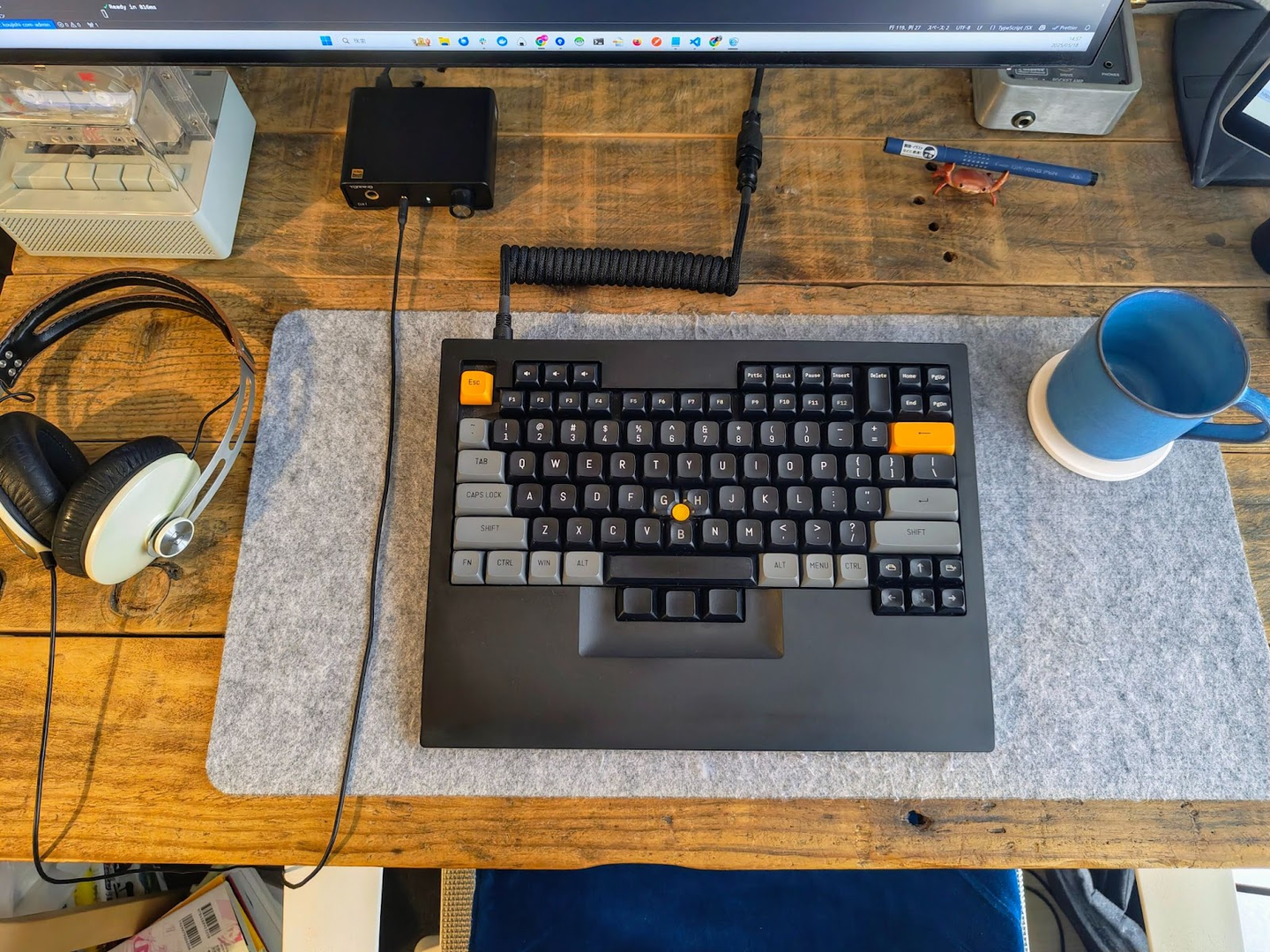 キーボードの打鍵音の反響を抑えるためにデスクマットを敷いています。また、デザフェスで購入したというカニペンホルダーが、デスク上のアクセントになっています。