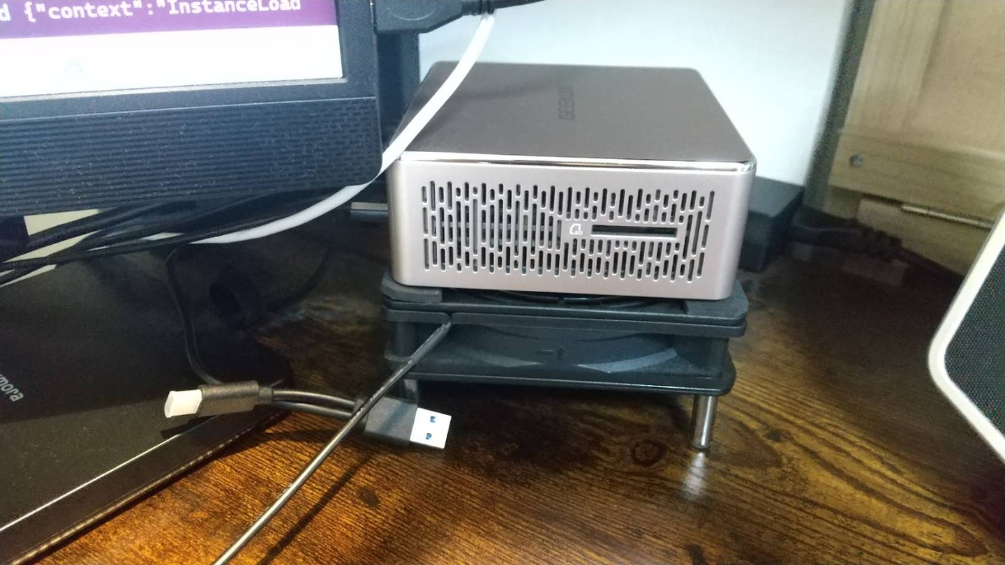 メインPCはメモリを64GBに増設したミニPC。スイッチ一つでモニターや周辺機器の接続を会社用PCとプライベートPCで切り替えられるようにしており、スムーズな連携を実現しています。