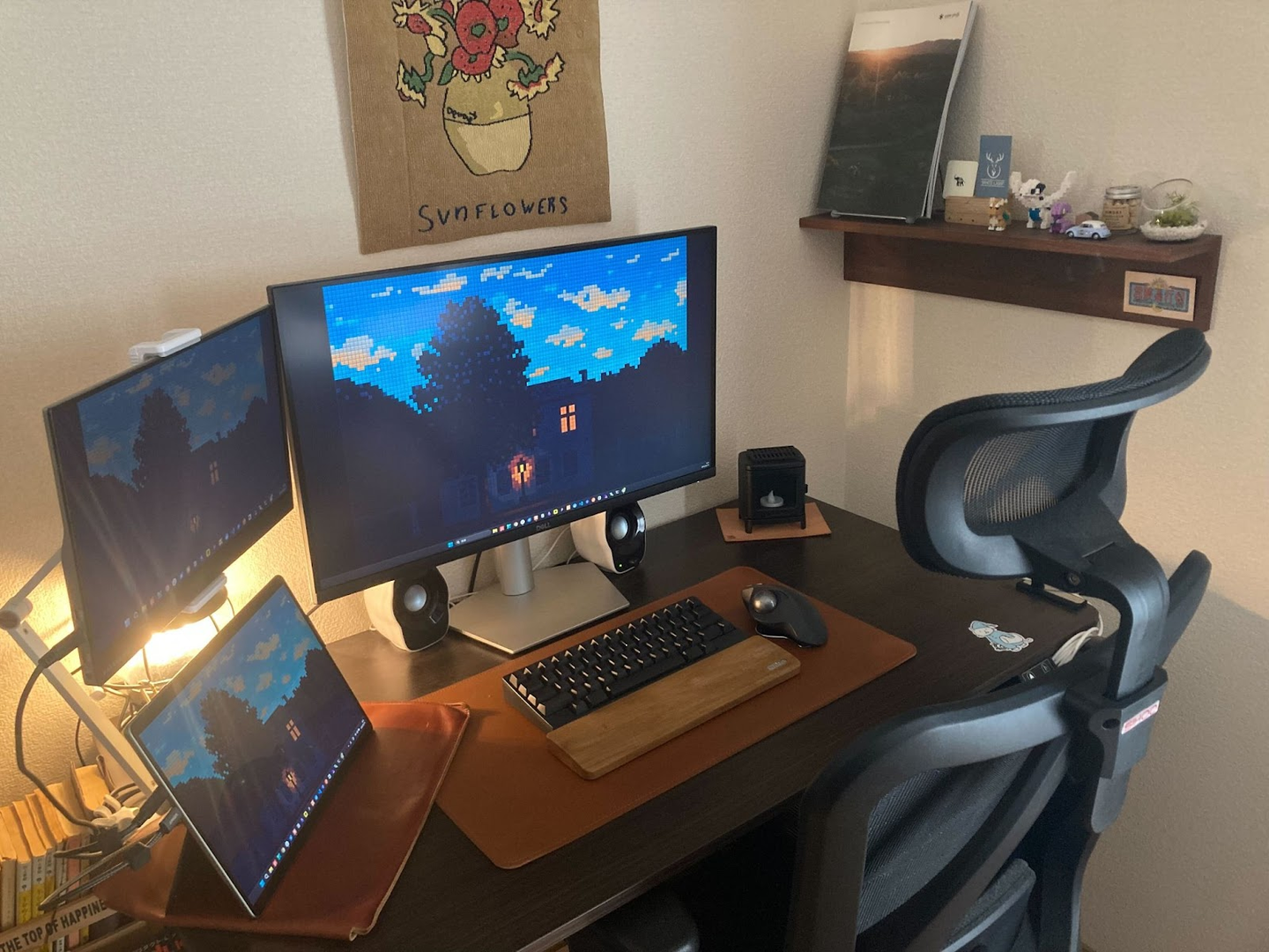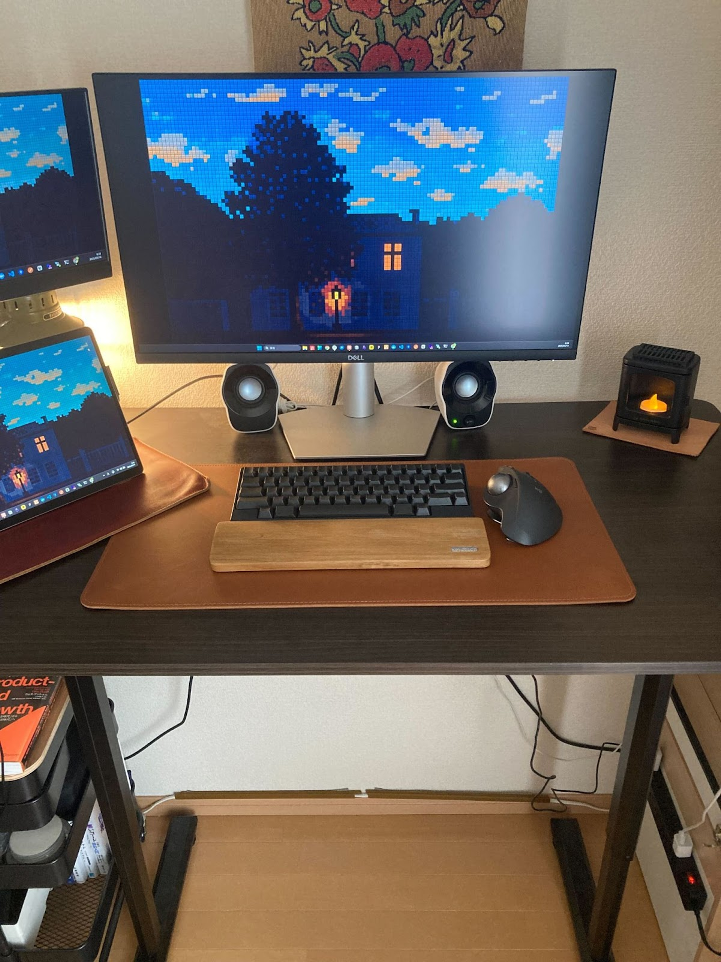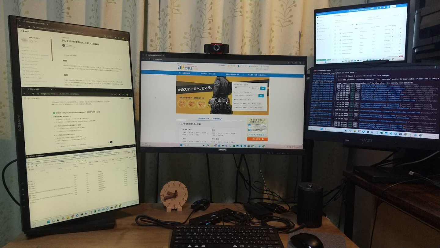 縦置きモニターを含め、複数のモニターを設置。記事を読んだり、複数のタブを開いたりする際に便利で、作業効率が格段に向上するそうです。