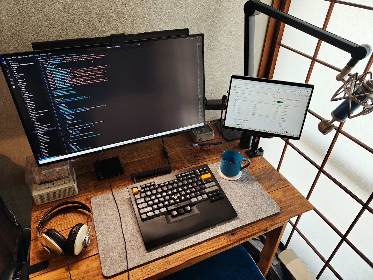 在宅用には、長年愛用しているTex Shinobi。Thinkpad由来のトラックポイントとメカニカルキーボードの組み合わせがお気に入り。キーキャップを交換し、「自分だけのキーボード」感を演出。会社用には、フリーアドレスに対応するため省スペースなTex Shuraを使用。こちらもキーキャップを交換し、愛着を持って使っています。