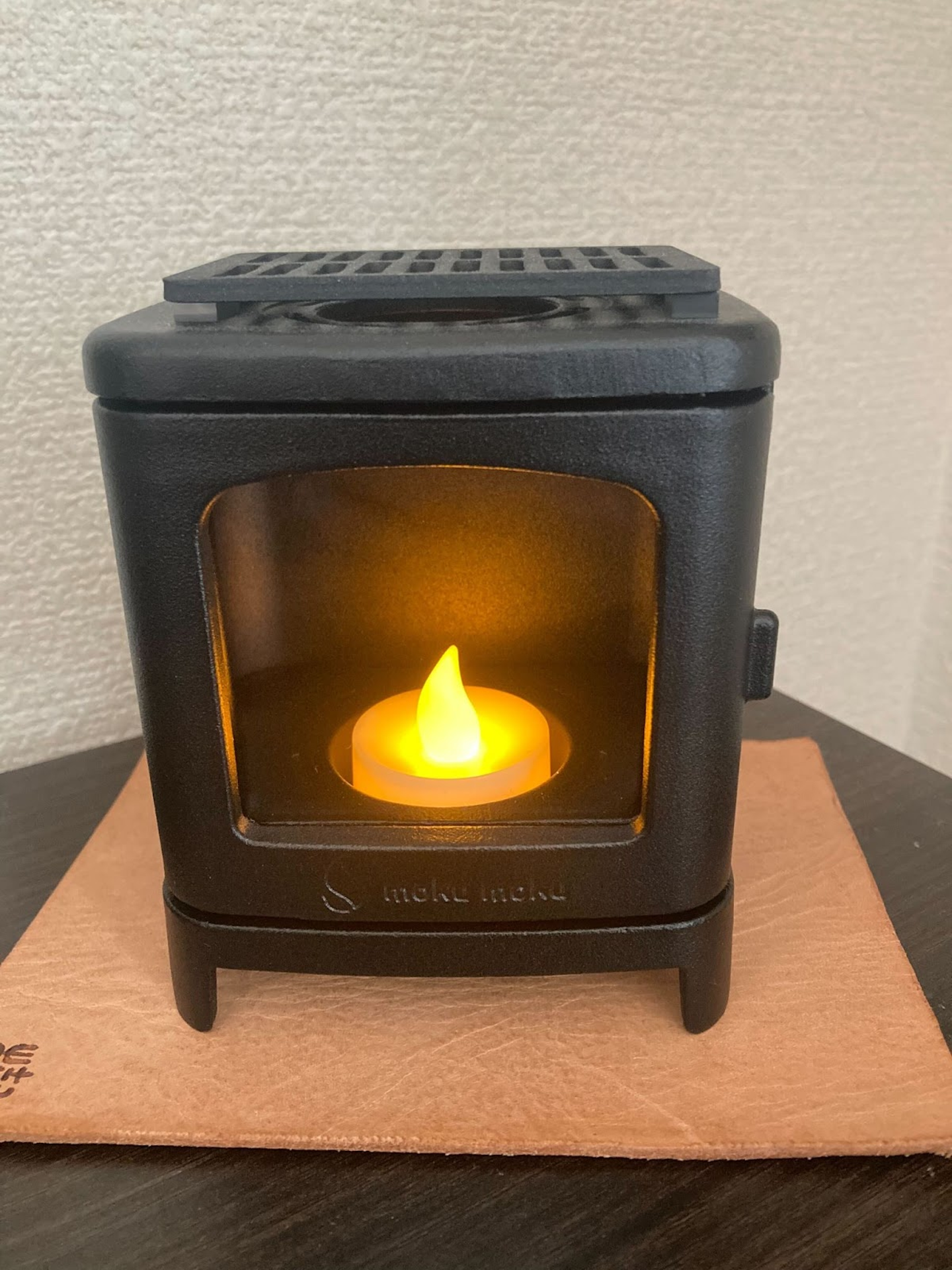 本物の薪ストーブと同じ素材で作られたミニチュアの薪ストーブ。LEDライトを入れて間接照明として楽しんだり、本物のキャンドルを灯して暖を取ったりと、仕事の合間の癒やしになっています。