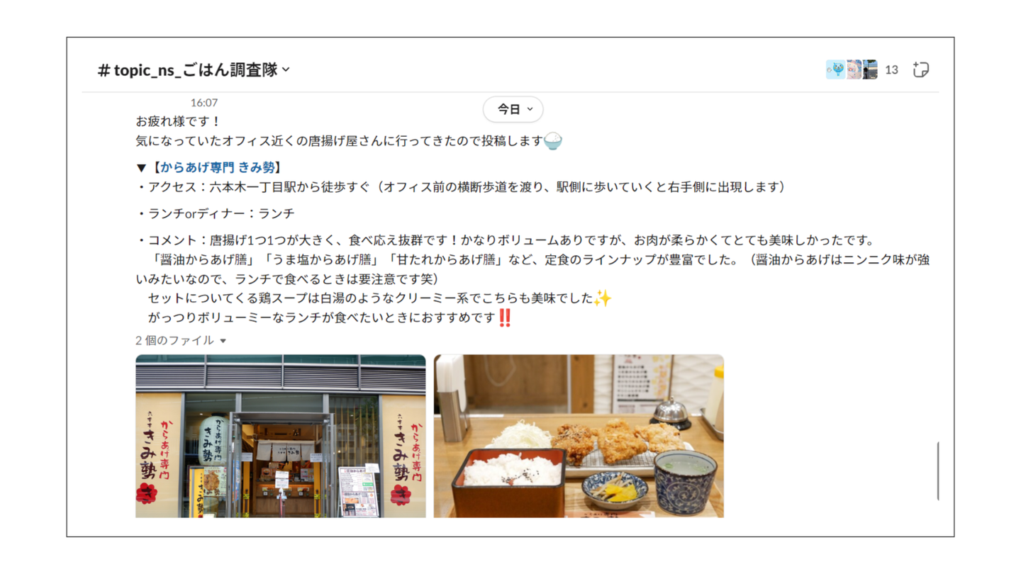そこで、Slack上のチャンネルにて「ごはん調査隊」を発足!