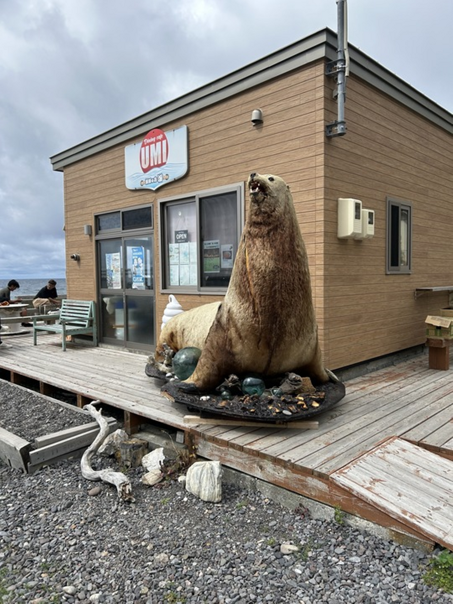 自転車でトンネル道を通り、20分くらいのところにあるUMIカフェ。入り口にある大きなトドが目印です。ウニクリームソースのオムライスやホッケのフライハンバーガーが食べられます。近くにはメノウ浜や地蔵岩などの観光地、木彫りを売っているお土産屋さんもあります。