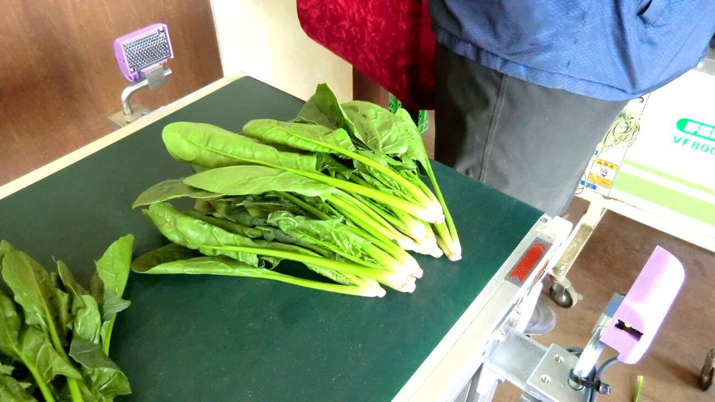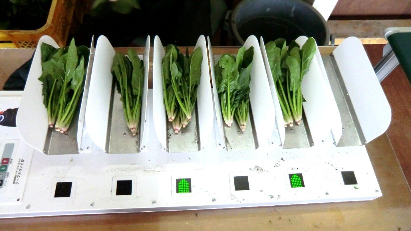 一番端のほうれん草を取り上げると、センサーが反応して次のほうれん草まで流れるという仕組みになっているようです。