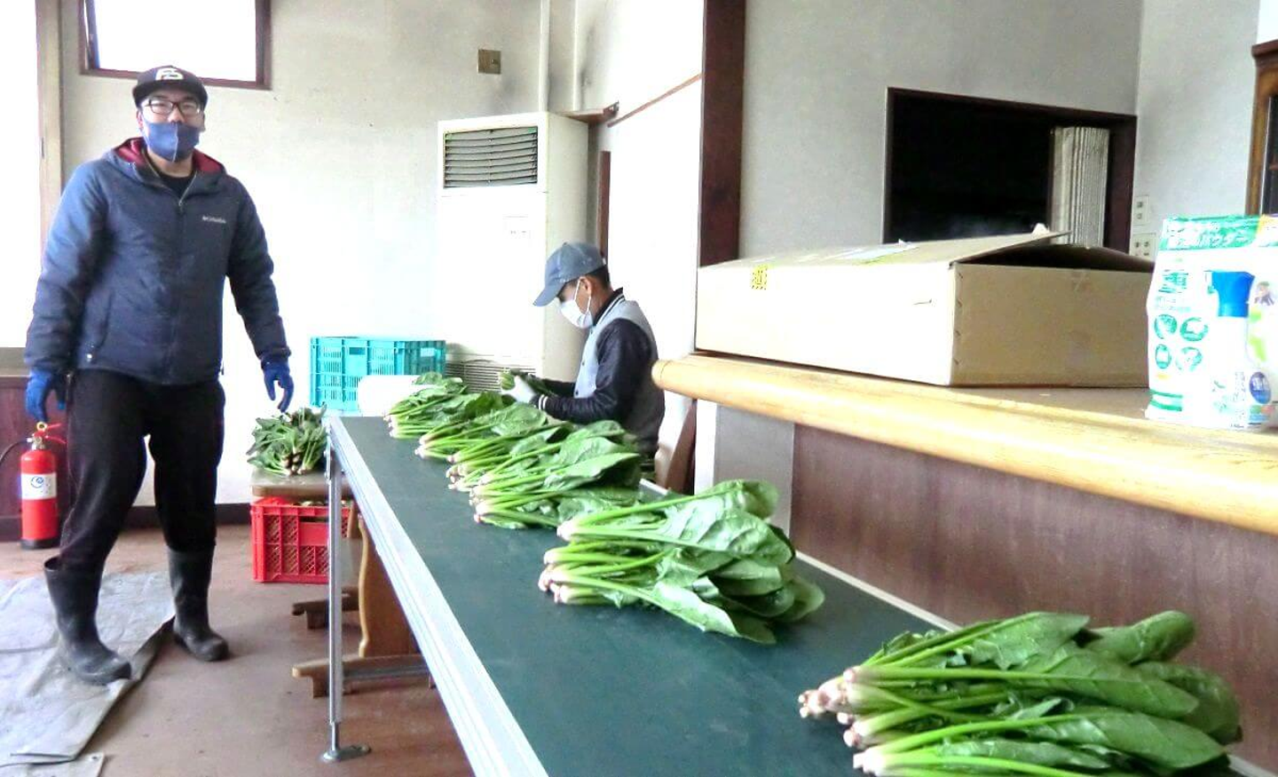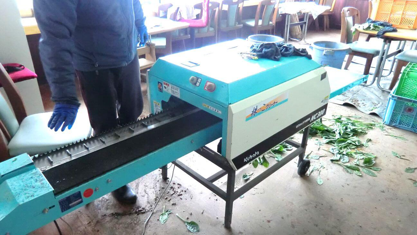 ということで、便利な機械を使って根を切り落としたほうれん草は、タオルできれいに汚れをふき取り次の工程へと移動します。