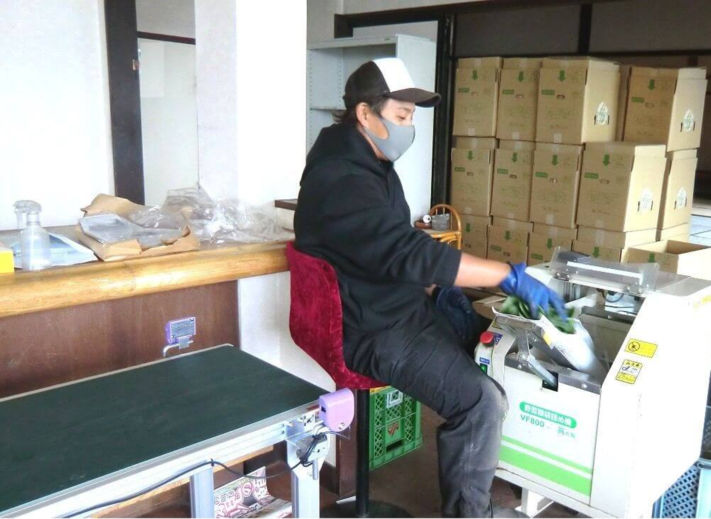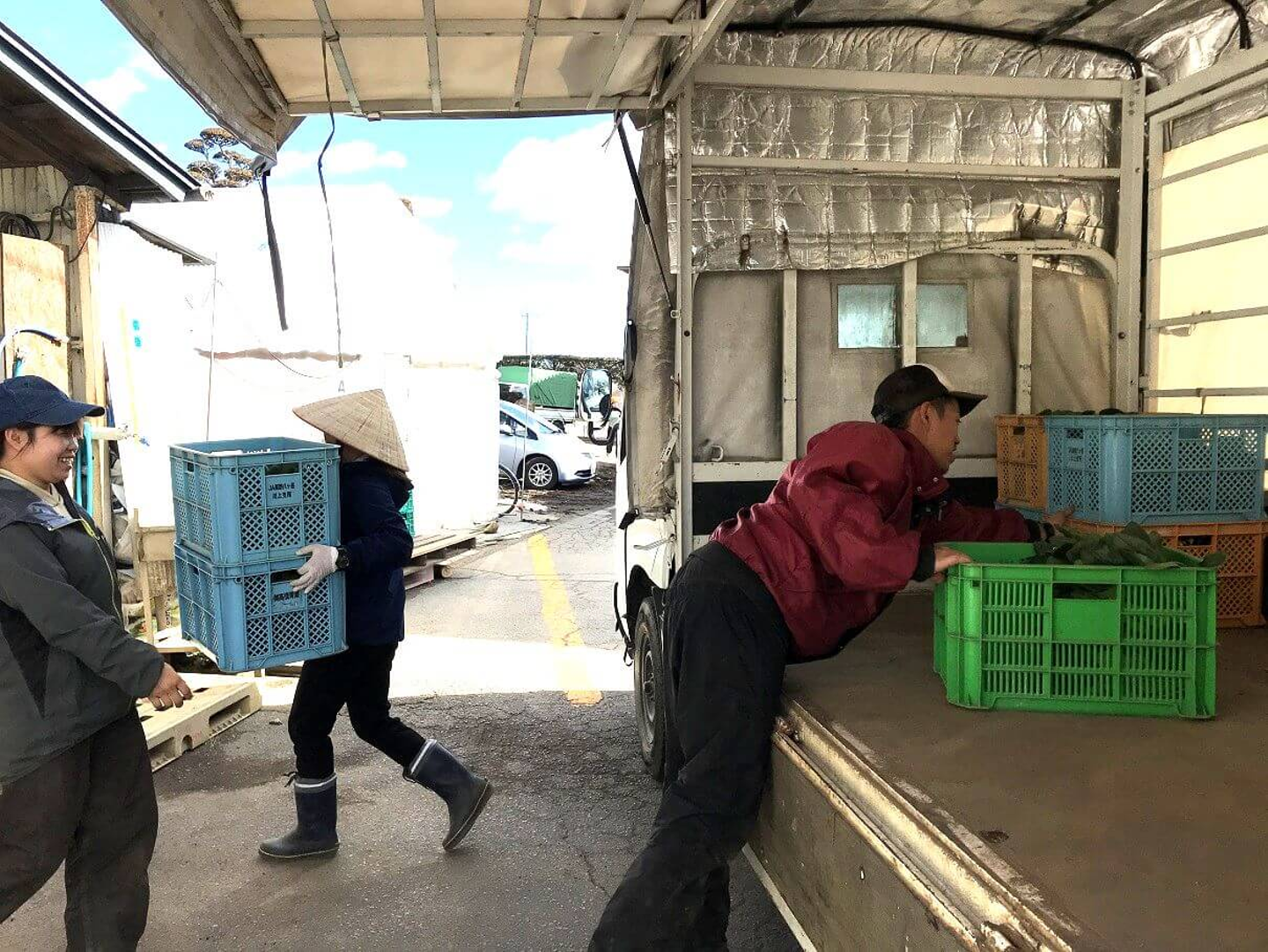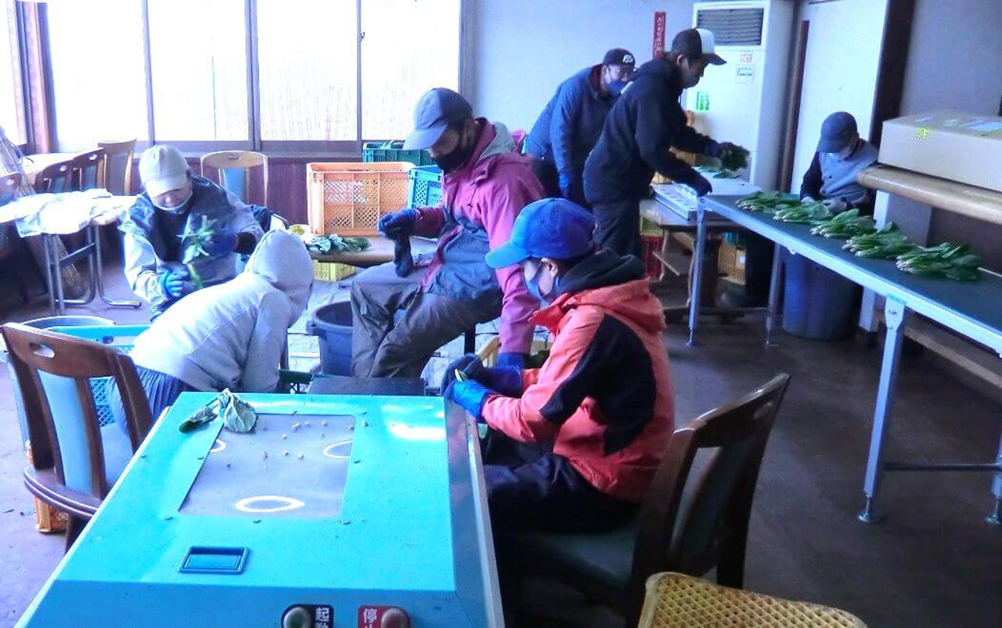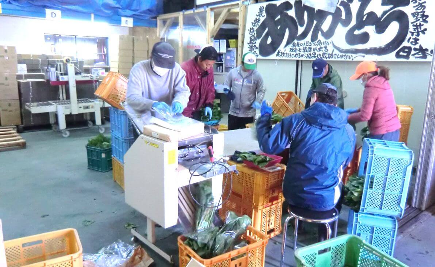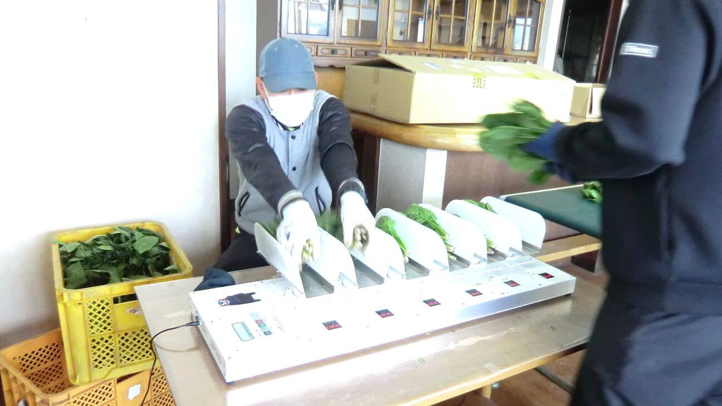 収穫量が多い時は広い作業場で、簡易の台を作り大人数で袋詰めを行なっています。