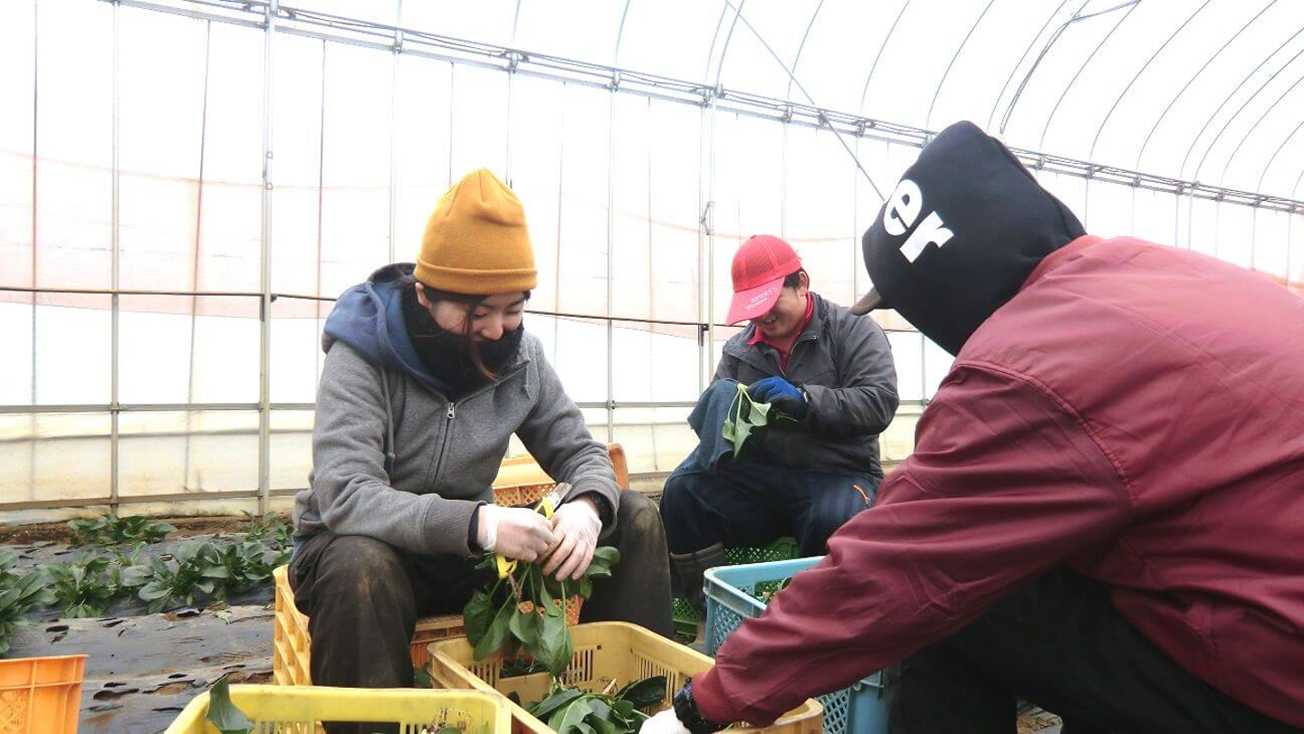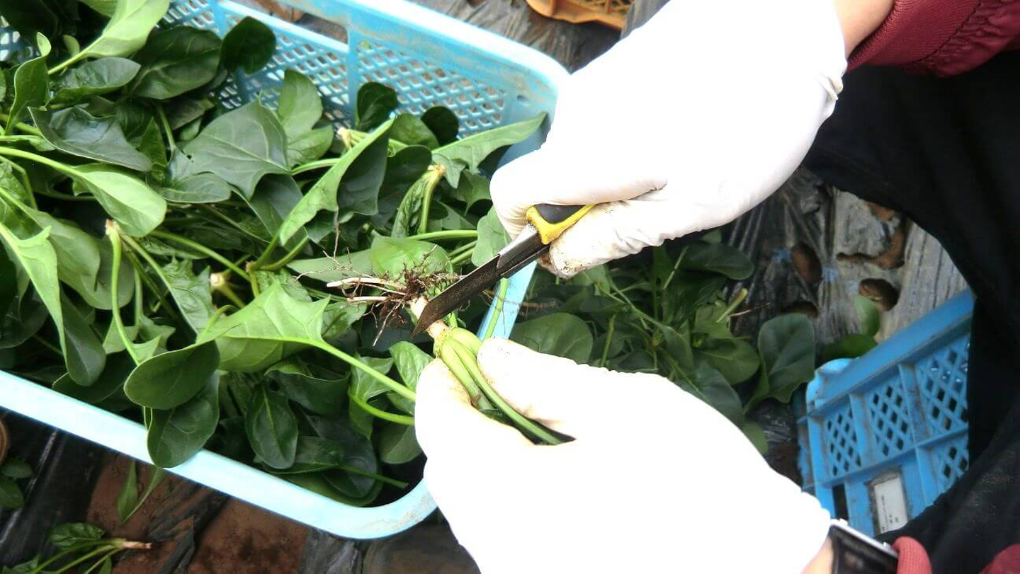 畑でほうれん草を収穫した後、カマからカッターに持ち替えて一つ一つ手作業で根を切り落としていました。