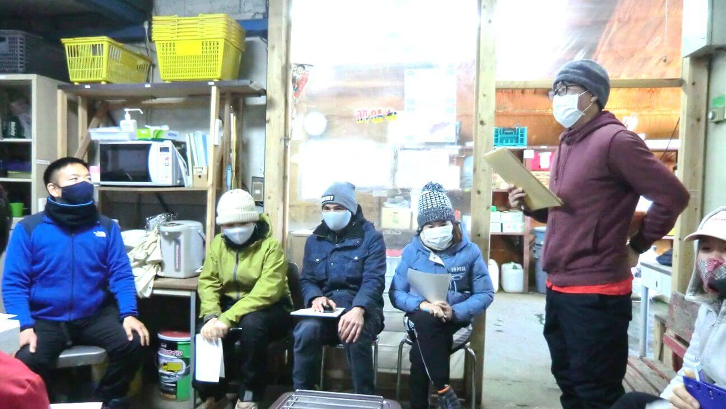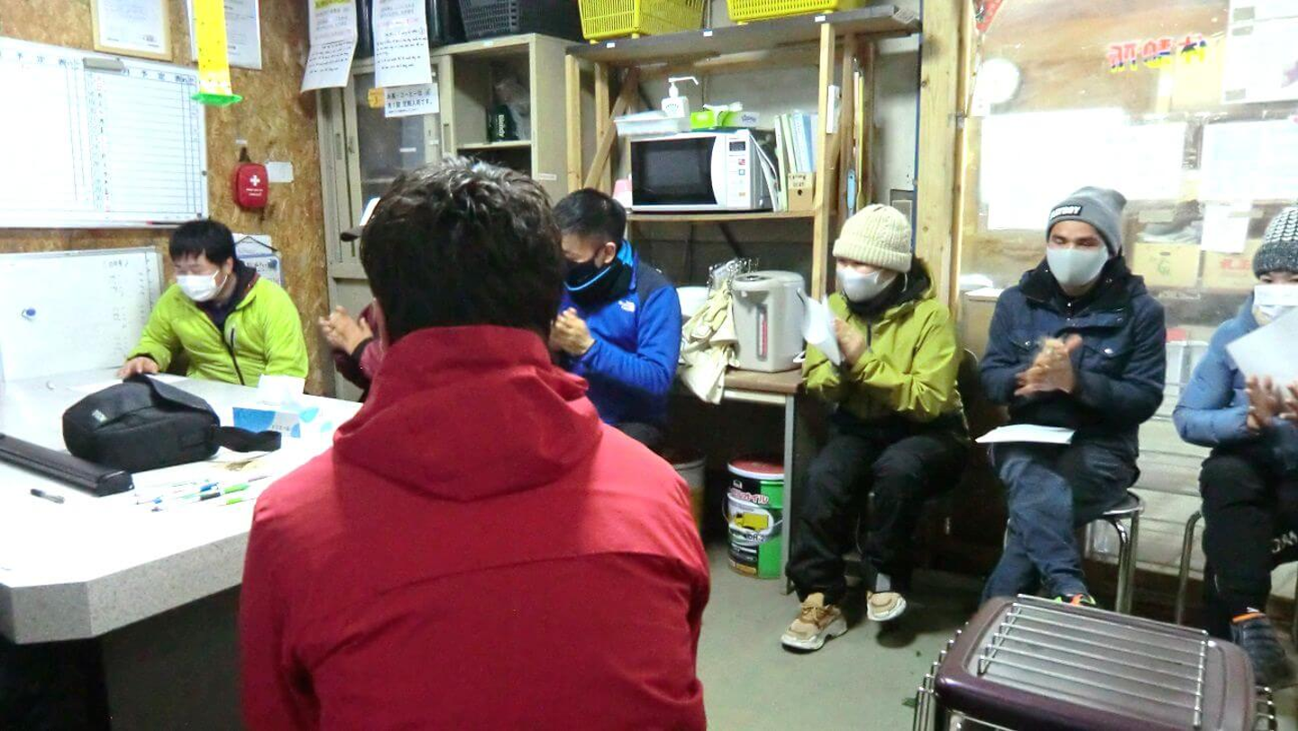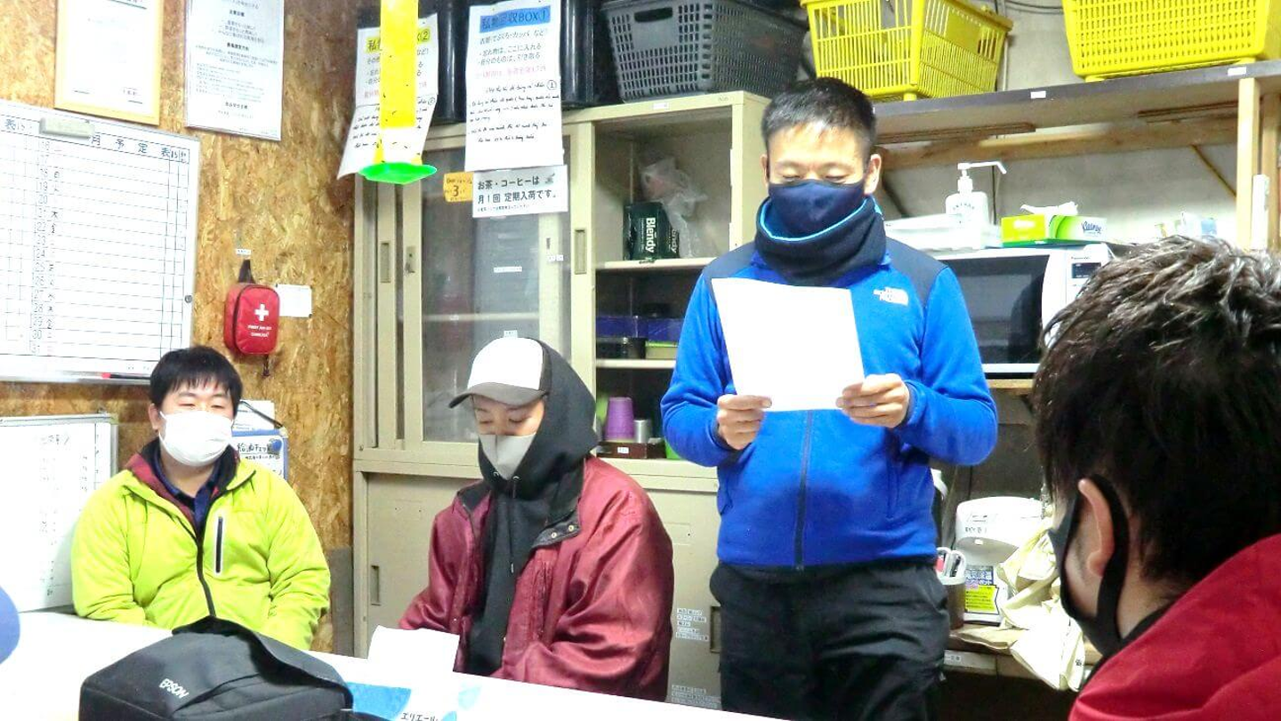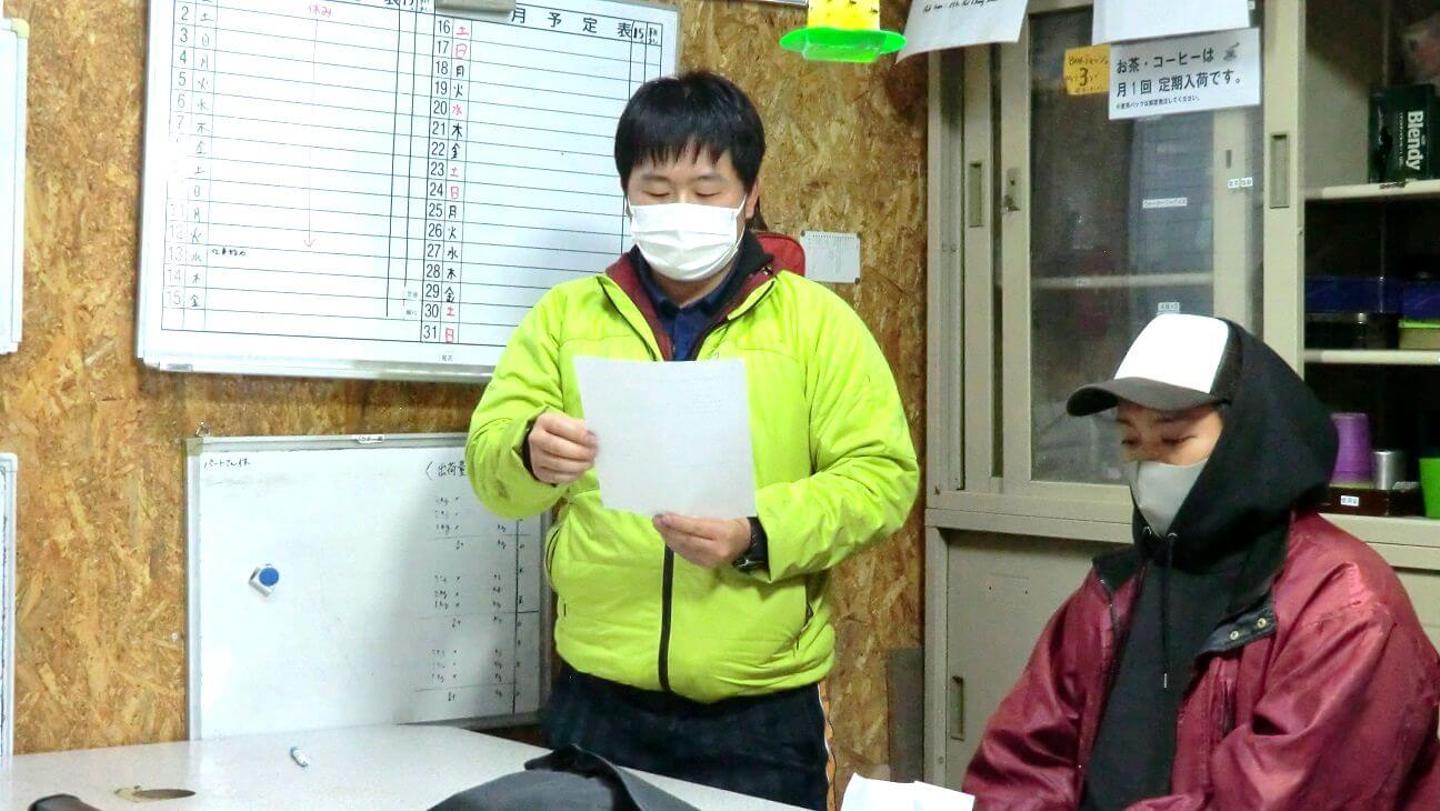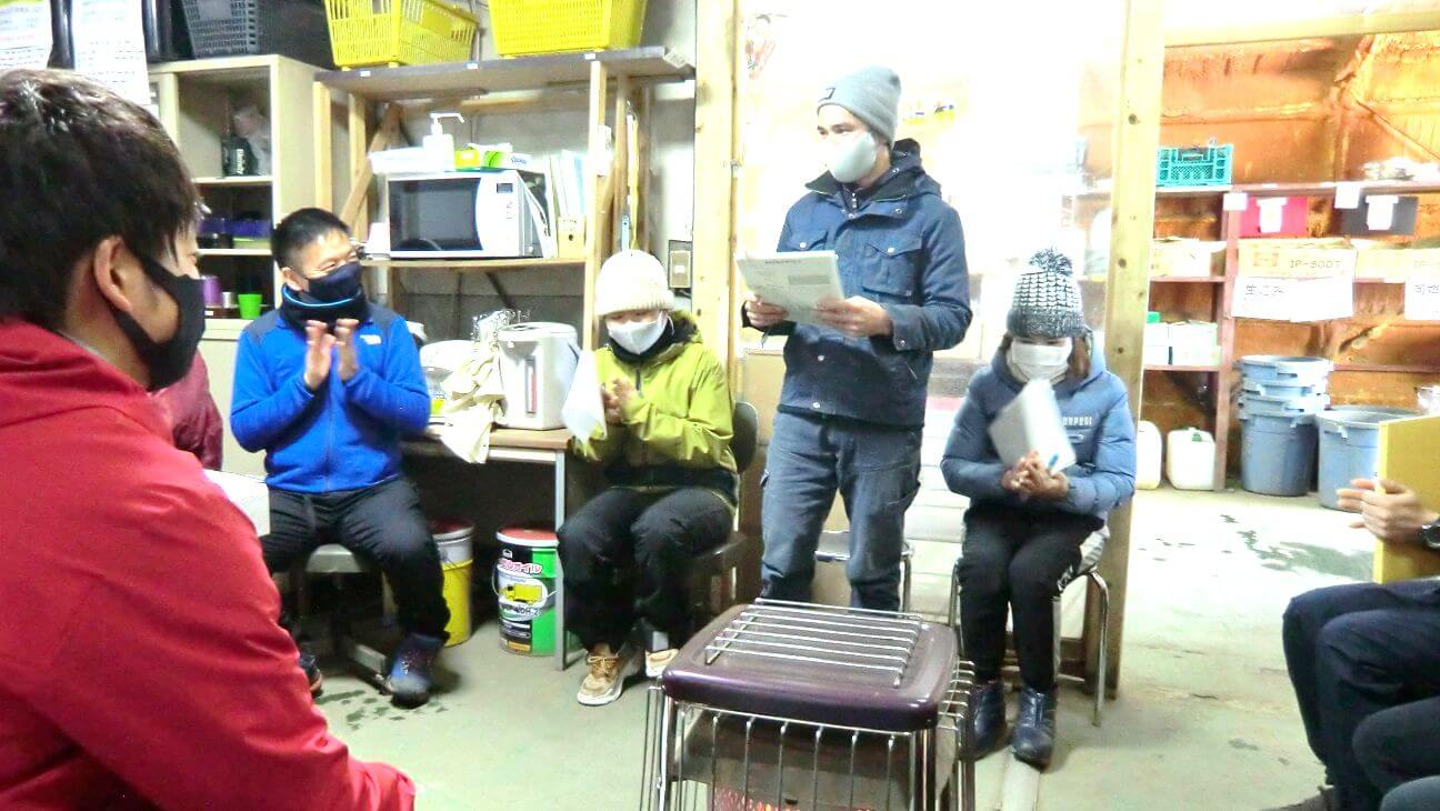 例年であれば初日に会場を借りて経営指針発表会を行ないますが、今年は新型コロナウイルス感染防止のため、休憩所で手短に行なわれました。