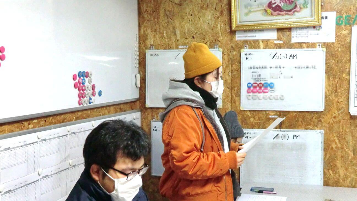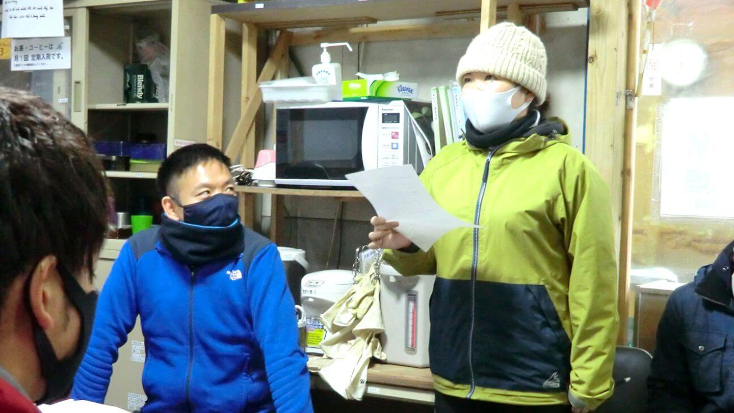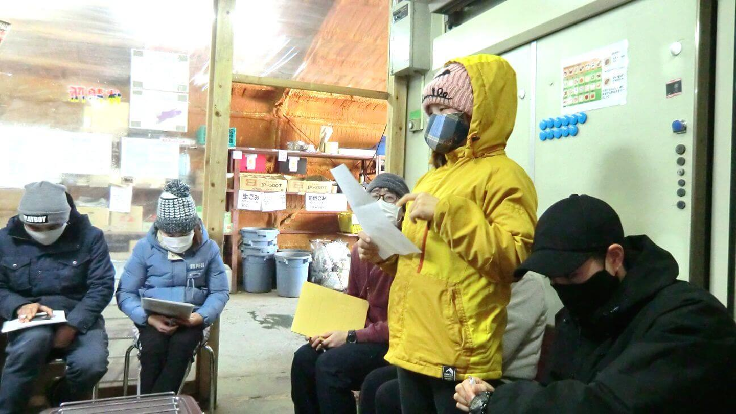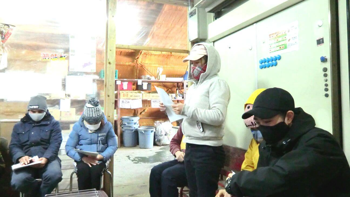 例年であれば初日に会場を借りて経営指針発表会を行ないますが、今年は新型コロナウイルス感染防止のため、休憩所で手短に行なわれました。