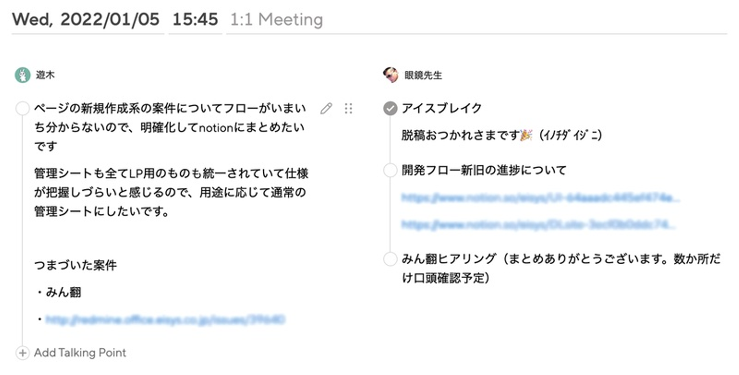 左側が私(遊木)、右側が上司(眼鏡先生)の欄になっており、話したい内容を事前に記載しておきます。当日はこのシートに沿って1on1を進めていきます。
