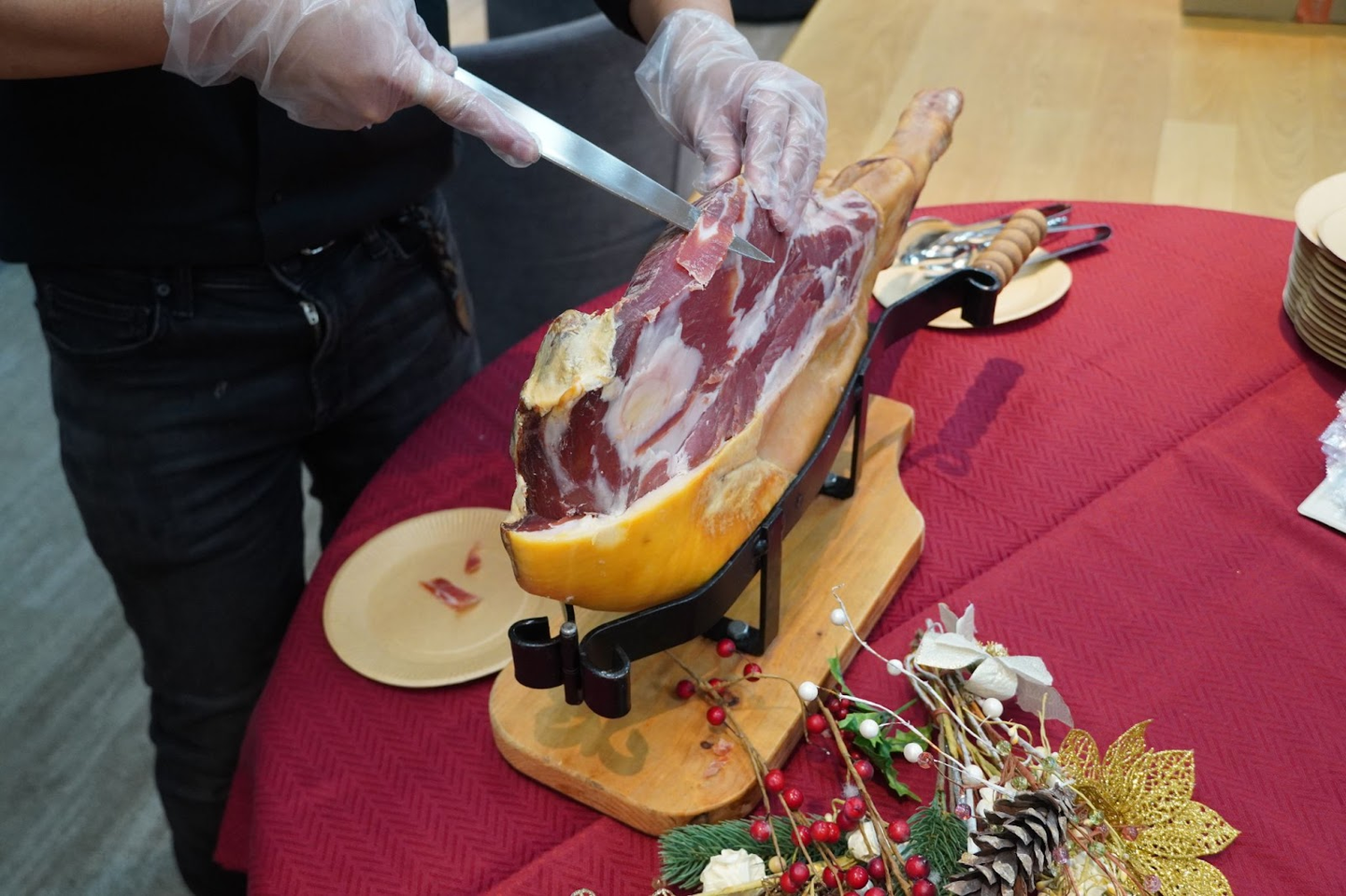 今回の忘年会で一際目をひいたのは…生ハムの原木!