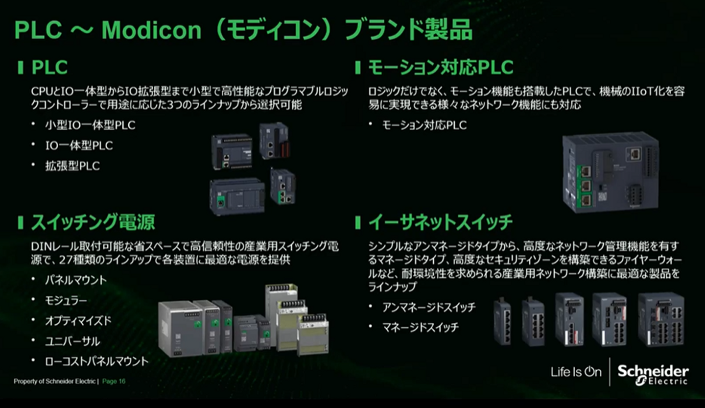 - PLC(プログラマブルロジックコントローラ)は、産業機器の制御を柔軟かつ高信頼で実現する、Modiconシリーズを中心とした制御の中核製品です。