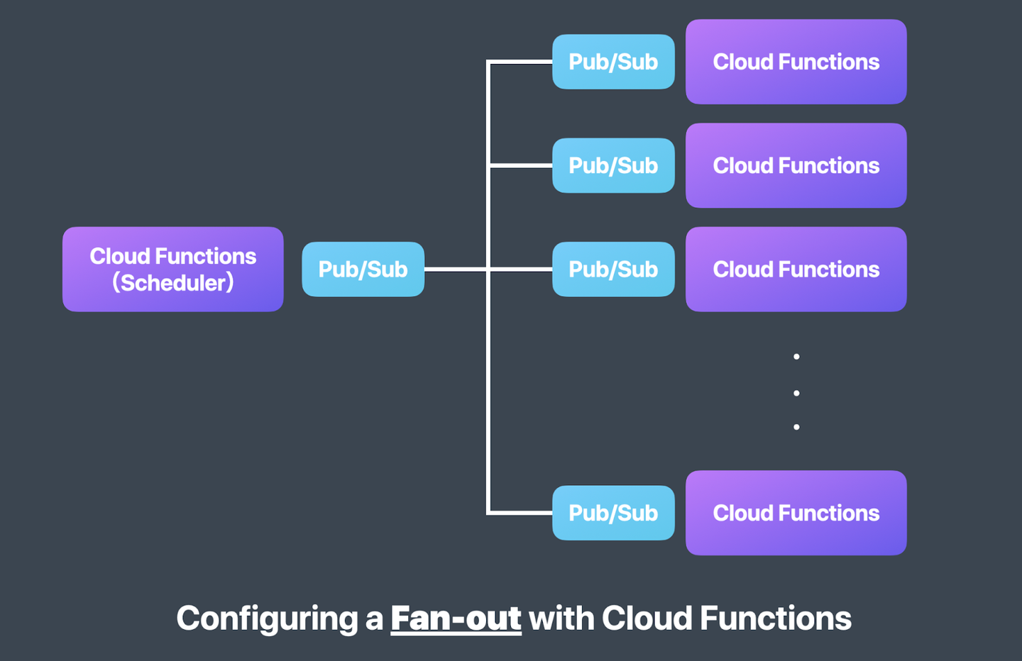 Scheduler と呼ばれる Cloud Functions が処理対象のデータを分散させたい単位にまとめて Pub/Sub に送信して、Pub/Sub の topic を subscribe している Cloud Functions が分散されたデータに対して処理を実行するという構成のこと。