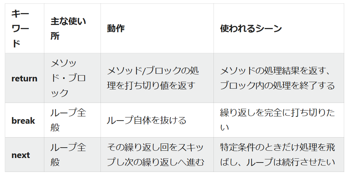 return: メソッドごと抜けるbreak: ループ処理から抜けるnext: ループ処理の「その回」をスキップする
