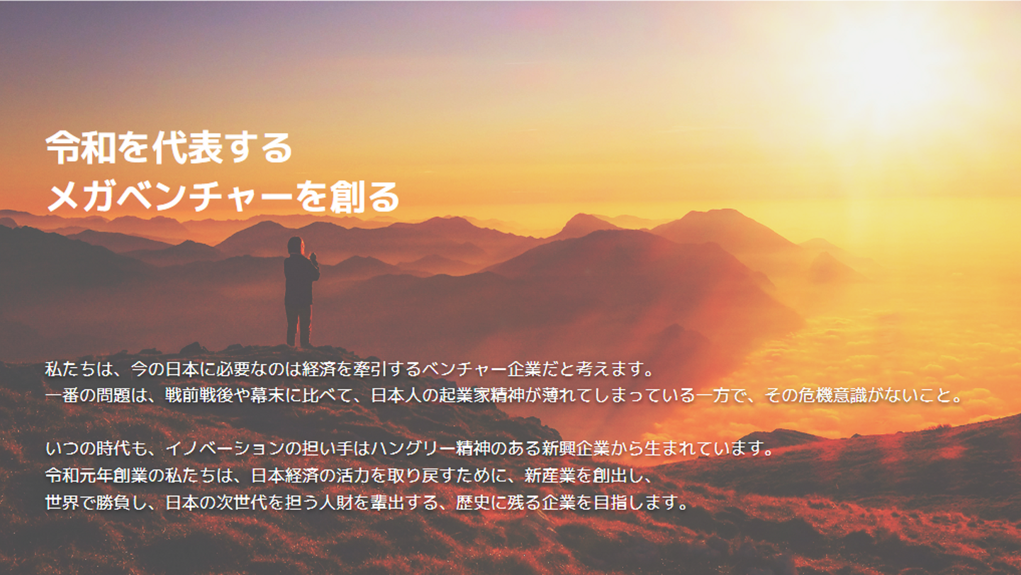 いつの時代も、イノベーションの担い手はハングリーな新興企業から生まれています。令和元年創業の私たちは「令和を代表するメガベンチャーを創る」をビジョンに、新しい産業を生み出し、次世代のリーダーを育て、歴史に残る企業を目指しています。