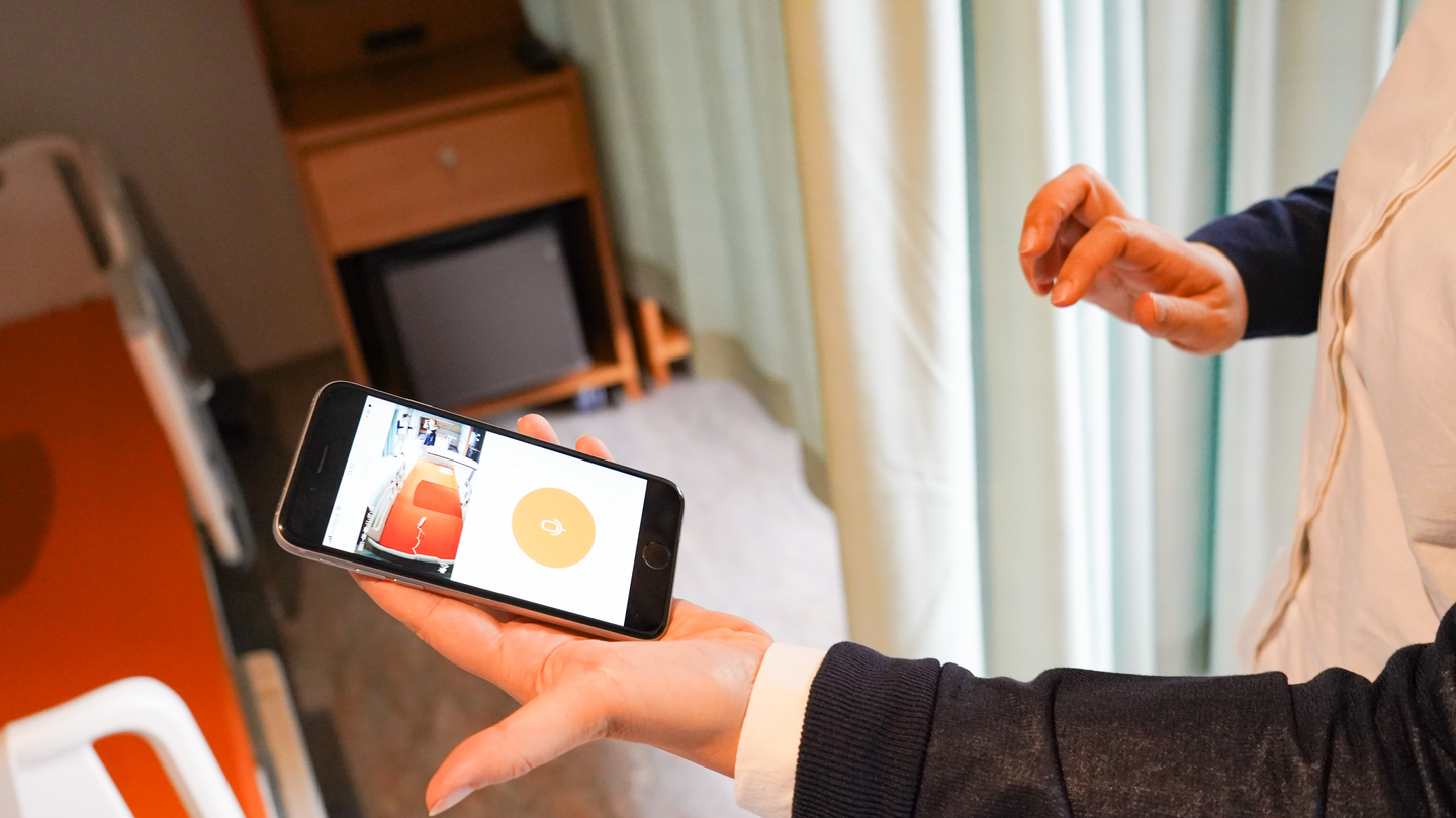 (病室の患者さんのベッド頭上に、WEBカメラが取り付けられている。)