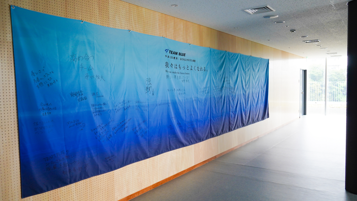 エレベーターを降りてすぐのフロアには、それぞれ会議室へと続く廊下があり、壁には開院時に掲げたTEAM BLUEメンバーそれぞれの目標が綴られています。