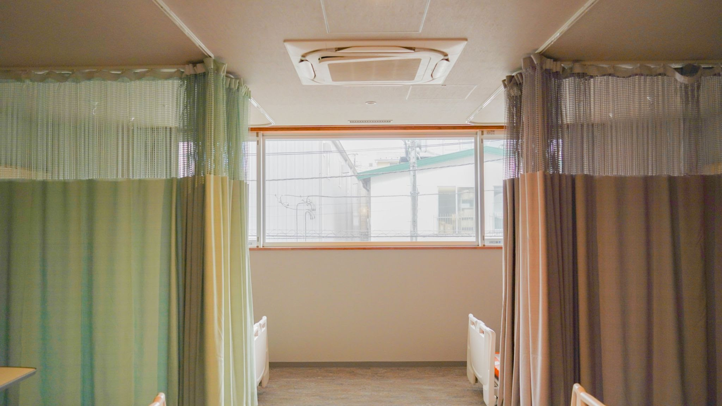 病室では、こんな風にあえてカーテンの色をあえてバラバラにしています。