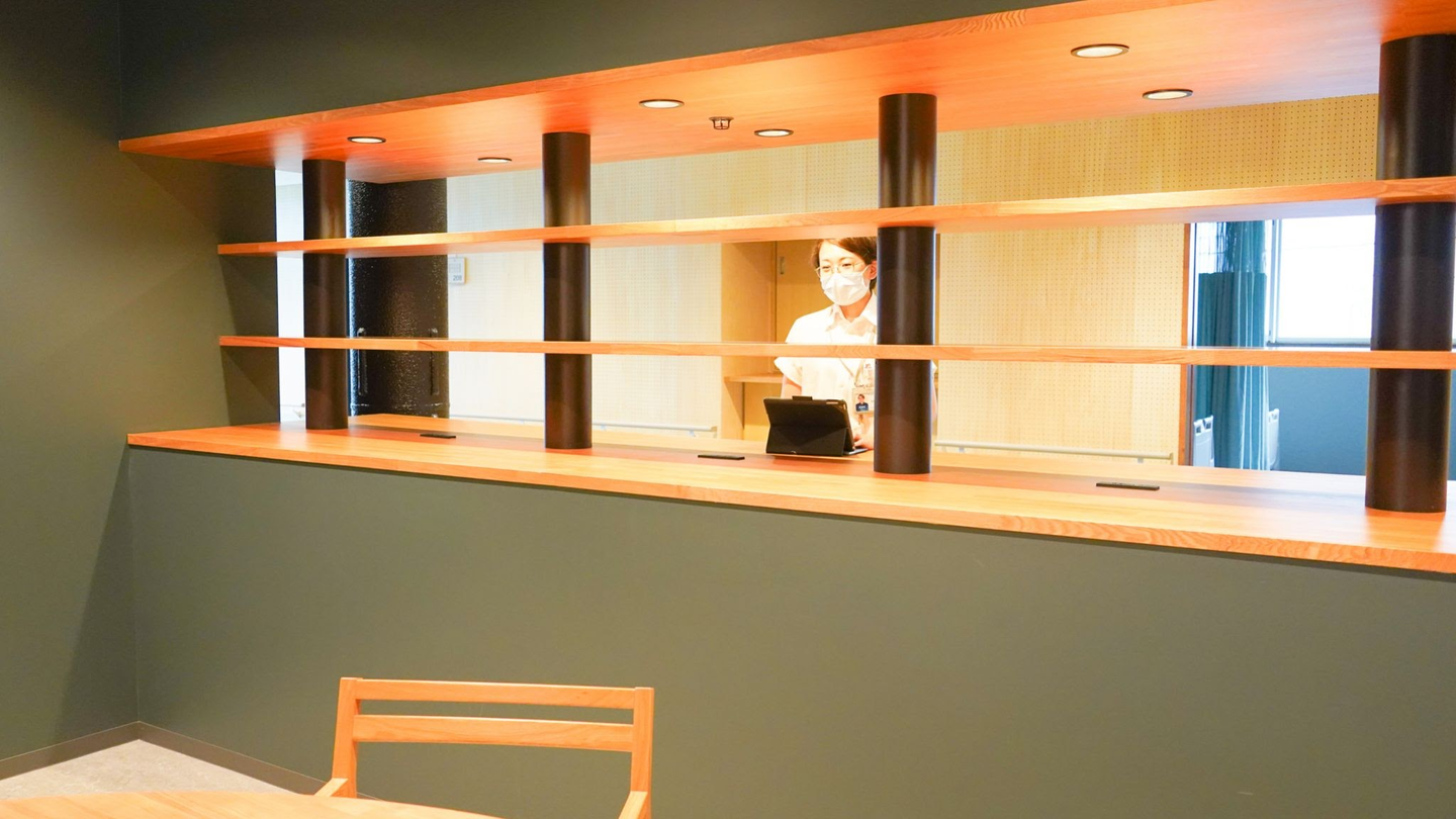 ここも、患者さんが声をかけやすい雰囲気になるよう解放感を大事にし、目の前の廊下も誰もが通れるように広々♪