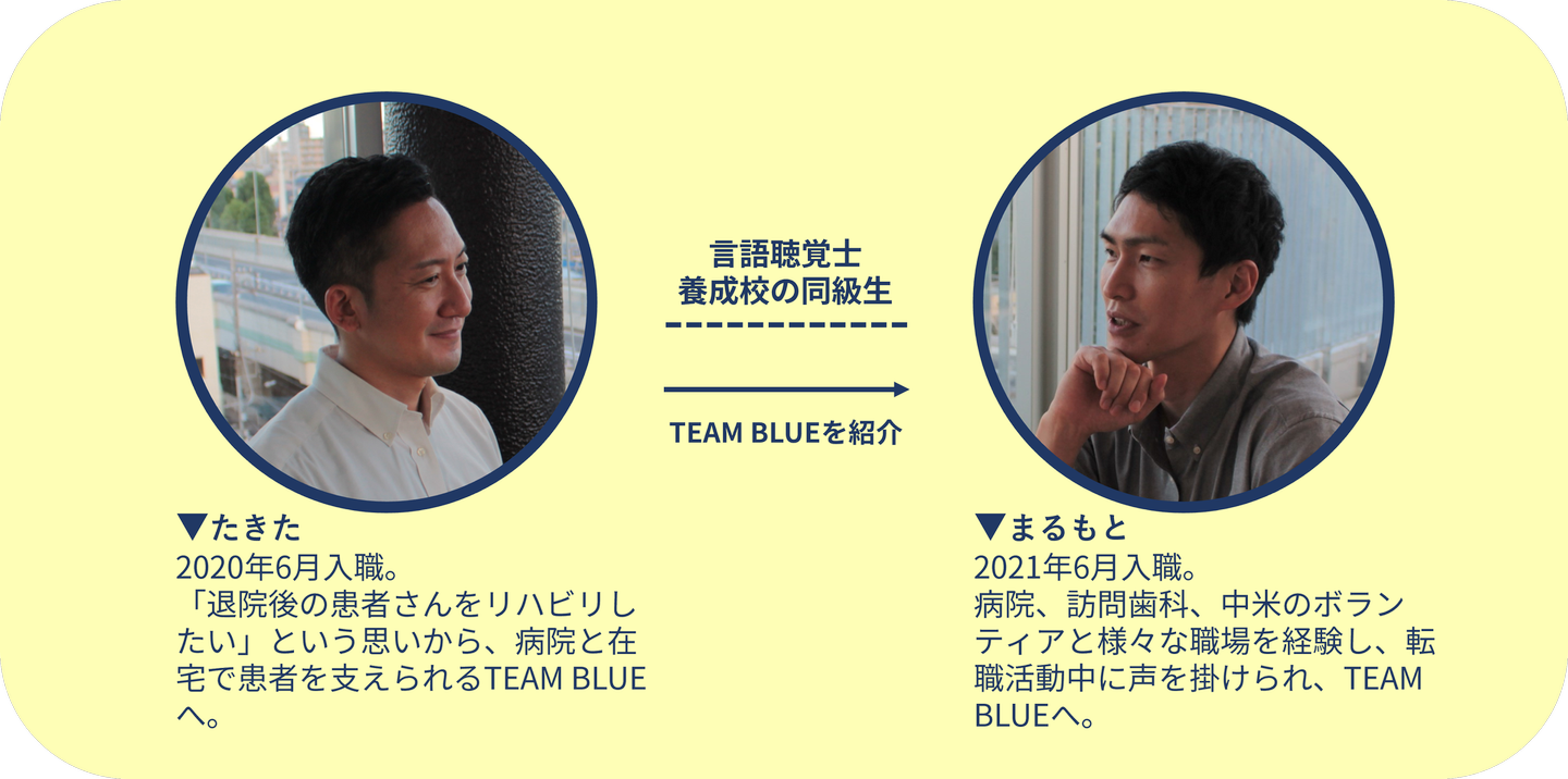 その時は、まだ「おうちにかえろう。病院」が建っておらず、ちょうど訪問リハビリテーションで言語聴覚士を募集していたので、「じゃあTEAM BLUEに来てください。面白い職場だよ。ただ、大変だよ」と紹介しました。