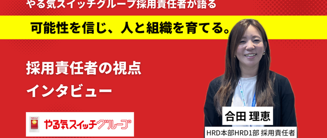 こんにちは、採用担当の救仁郷(くにごう)です。「採用」は、会社の未来をつくる仕事。そして、“仲間を見つける”という、誰かの人生に関わる仕事でもあります。今回は採用責任者として日々学生や候補者と向き合っている、HRD本部HRD1部 合田理恵 副部長へ、やる気スイッチグループで働く魅力・採用にかける想い・これから仲間に加わってほしい人物像 についてお話を伺いました。合田 理恵(ごうだ りえ)・HRD本部HRD1部 副部長           ※HRD(Human Resource Development)人材育成・組織開発──入社の経緯や役割を教えてください──当社で働く魅力・やりがいはどん...