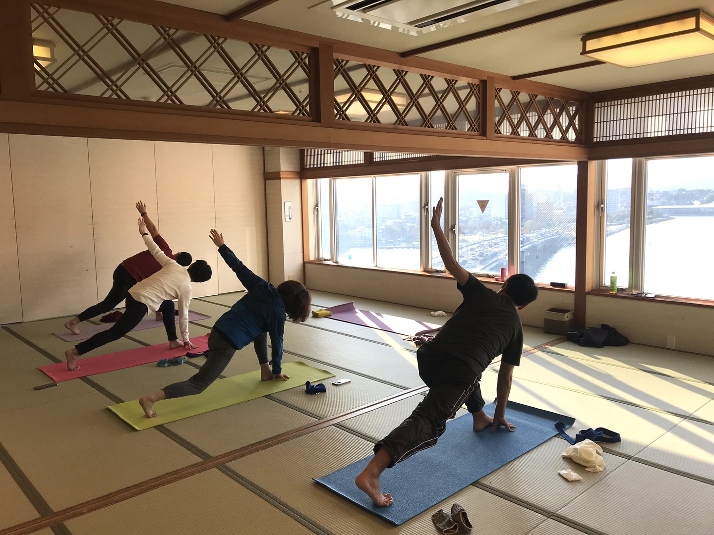 外の景色を見ながらの朝ヨガを行います。朝からしっかり体を動かしていきます。