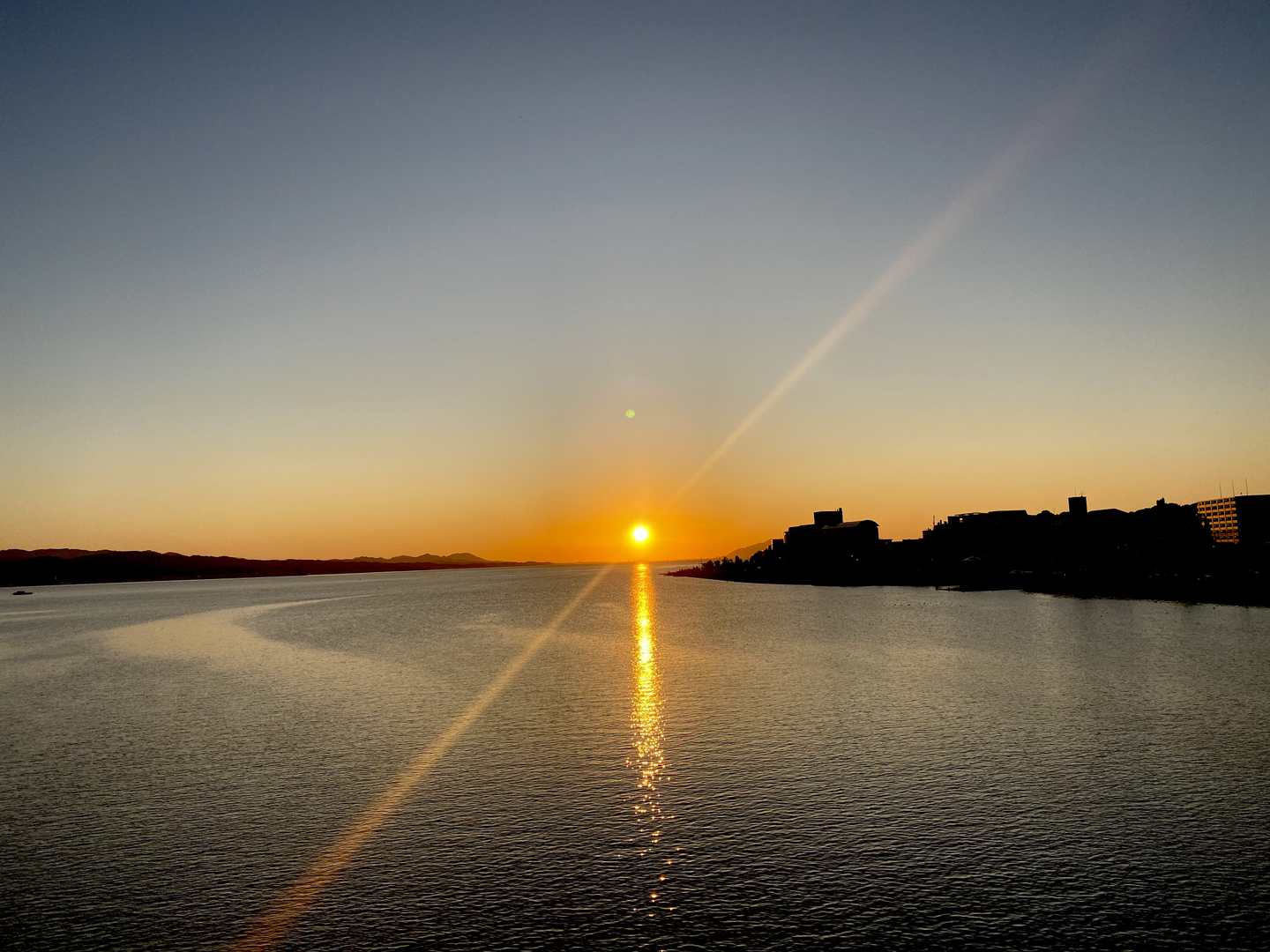 宍道湖の夕日の写真です。水面に反射して、幻想的な雰囲気があります。