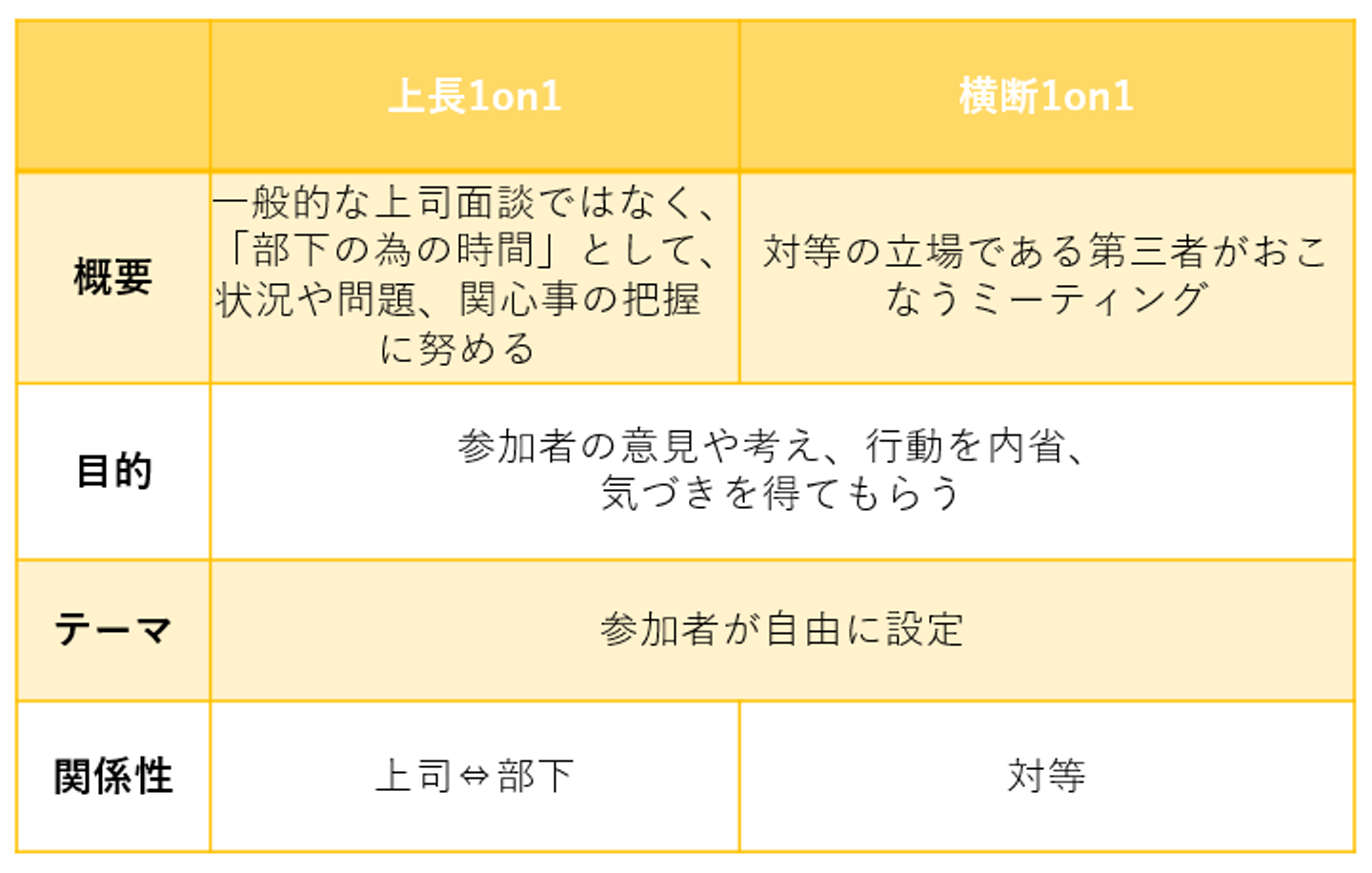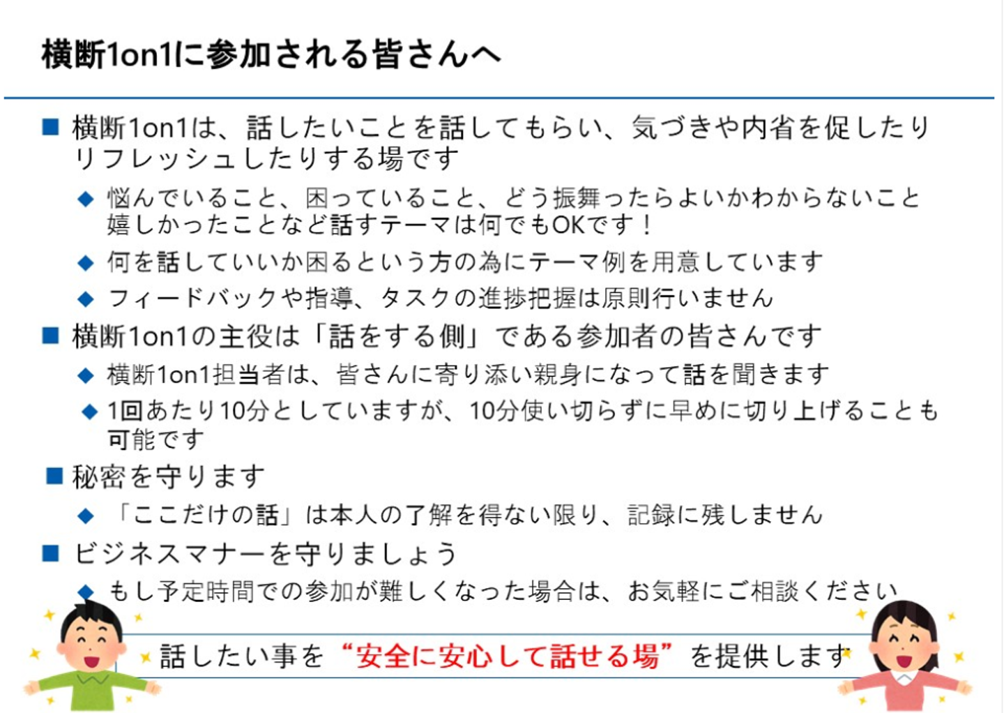 「横断1on1」を初めて始めて聞く方もいるかもしれません。この1on1は対等の立場の第三者が行います。上司と部下の面談以外に、仕事でのモヤモヤを聞いてもらってスッキリしたり、誰に聞いていいのかわからないことを確認したり…、そんな横断的に支援してくれる「場」をつくることで、心理的な不安を解消できればと考えています。
