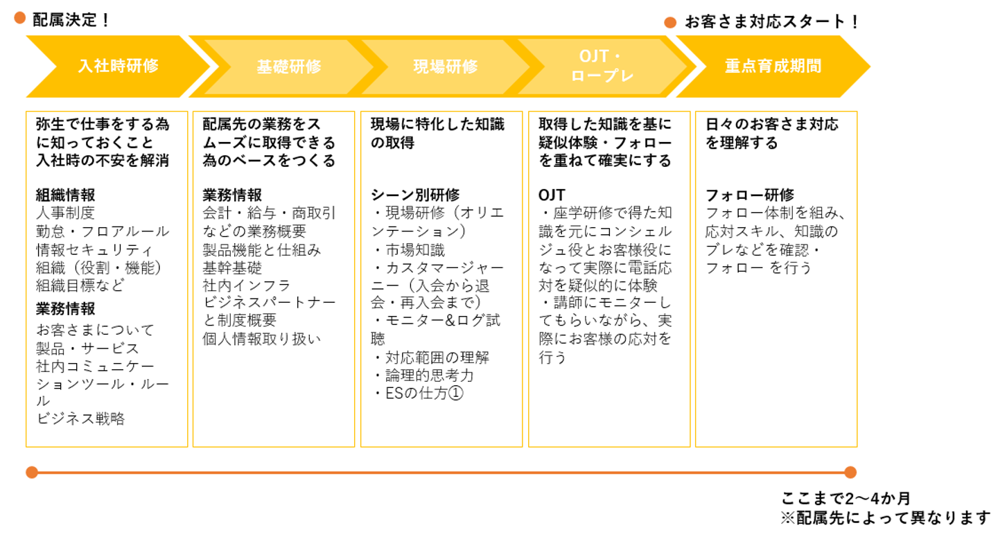 配属先によって異なりますが、2~4か月のオンボーディングを通じて、お客さま対応に必要なスキルをしっかり学んでいきます。会計・給与・商取引のそれぞれの業務の基礎を理解してから、実際の製品機能を学ぶといったように、段階的に理解が深められるように研修を進めていきます。
