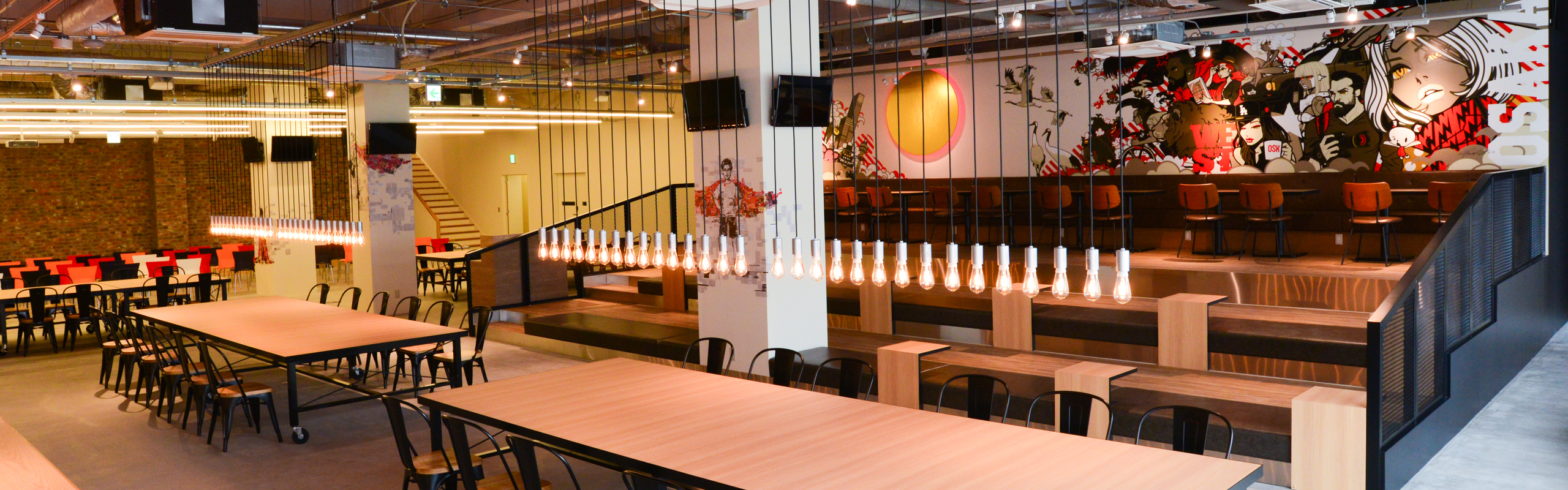 各部屋ごとに異なるアートを持つMTGスペースや、「和」を感じる執務室など、拘りのオフィスとなっております。また、イベントスペース併設のレストランでは社食も提供しています。