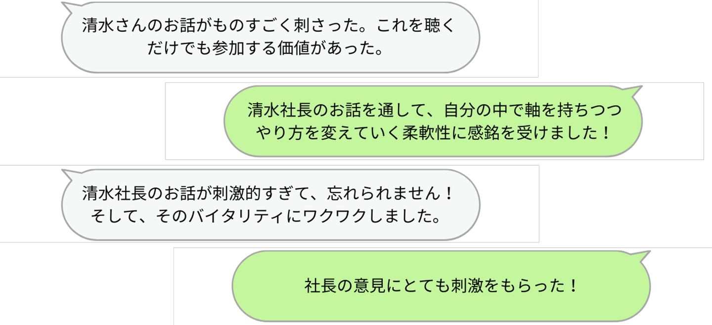 運営をしていた僕の感想にはなりますが、講演終了時には、参加学生が開始前よりも晴れやかで、少し前を向いている面構えになっていたと感じました。チャットやアンケートに寄せられた感想の一部をご紹介します。