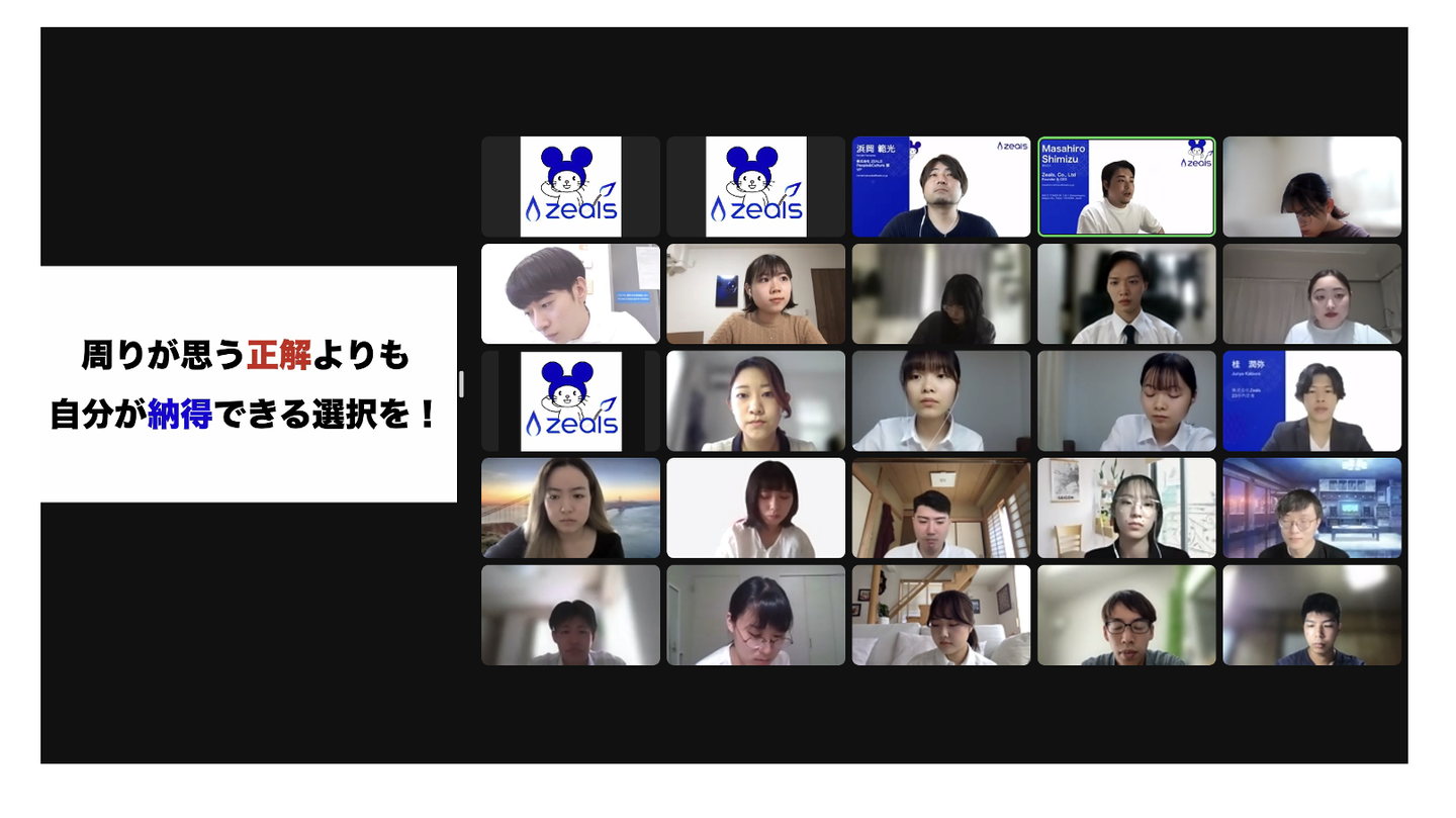 ZEALSという会社を知るだけでなく、みなさん自身がキャリアを考えるきっかけを提供したい。就職活動を始めたばかりの今、自分が大切にしたい「軸」の輪郭を明らかにしてほしい。